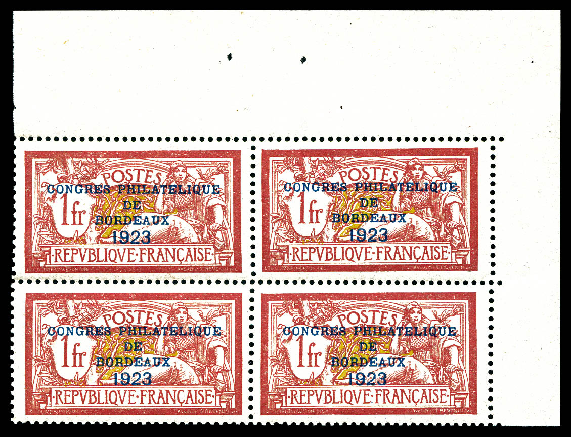 N°182, Congrès de Bordeaux de 1923 en bloc de quatre coin de feuille, très bon centrage, SUPERBE (certificat) Qualité: ** Cote:
