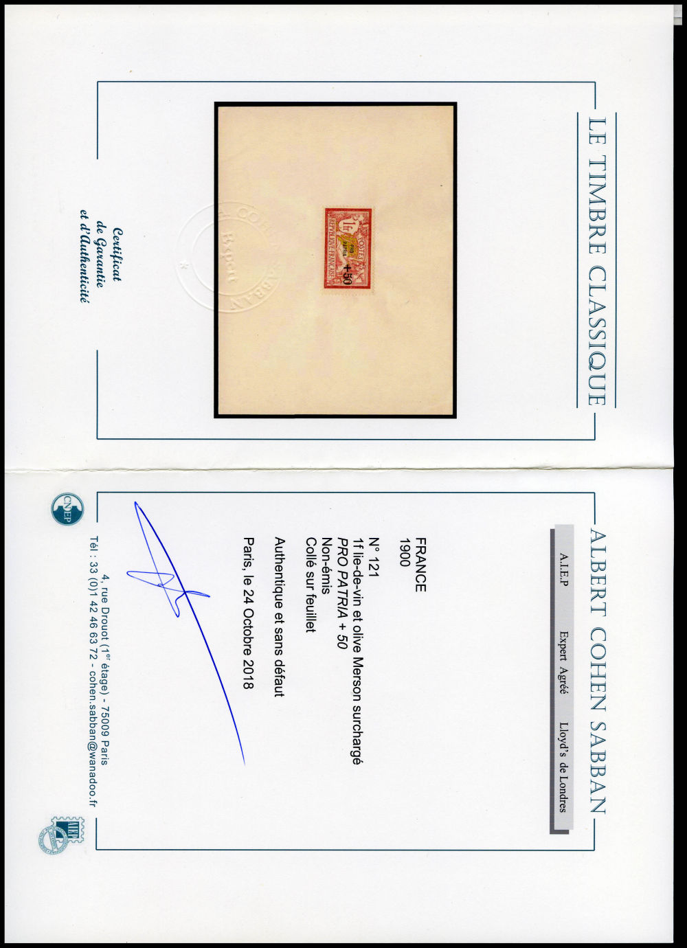 Maury N°3E, Non émis: Merson 1F +50c lie de vin et olive surchargé 'PRO PATRIA' en rouge sur feuillet de présentation, SEULE PIECE