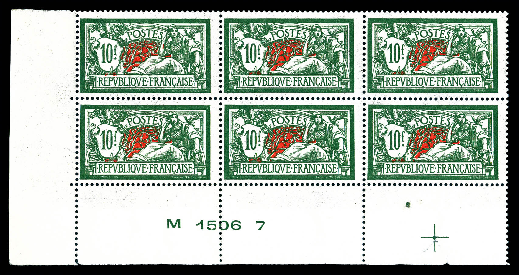 N°207, Merson, 10f vert et rouge en bloc de six coin de feuille avec croix de repère et numéro. SUPERBE (certificat) Qualité: **