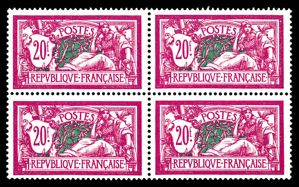 N°208, 20f Merson en bloc de quatre, très bon centrage. SUP (certificat) Qualité: ** Cote: 3600 euros (Image)