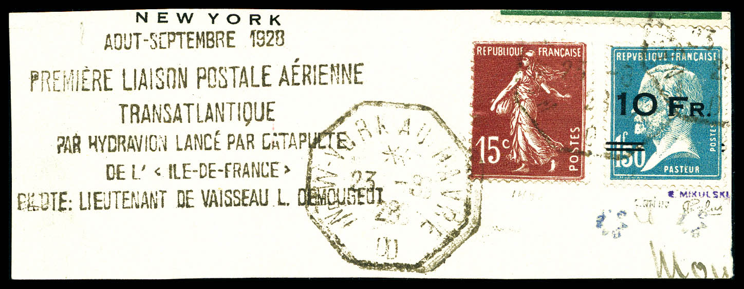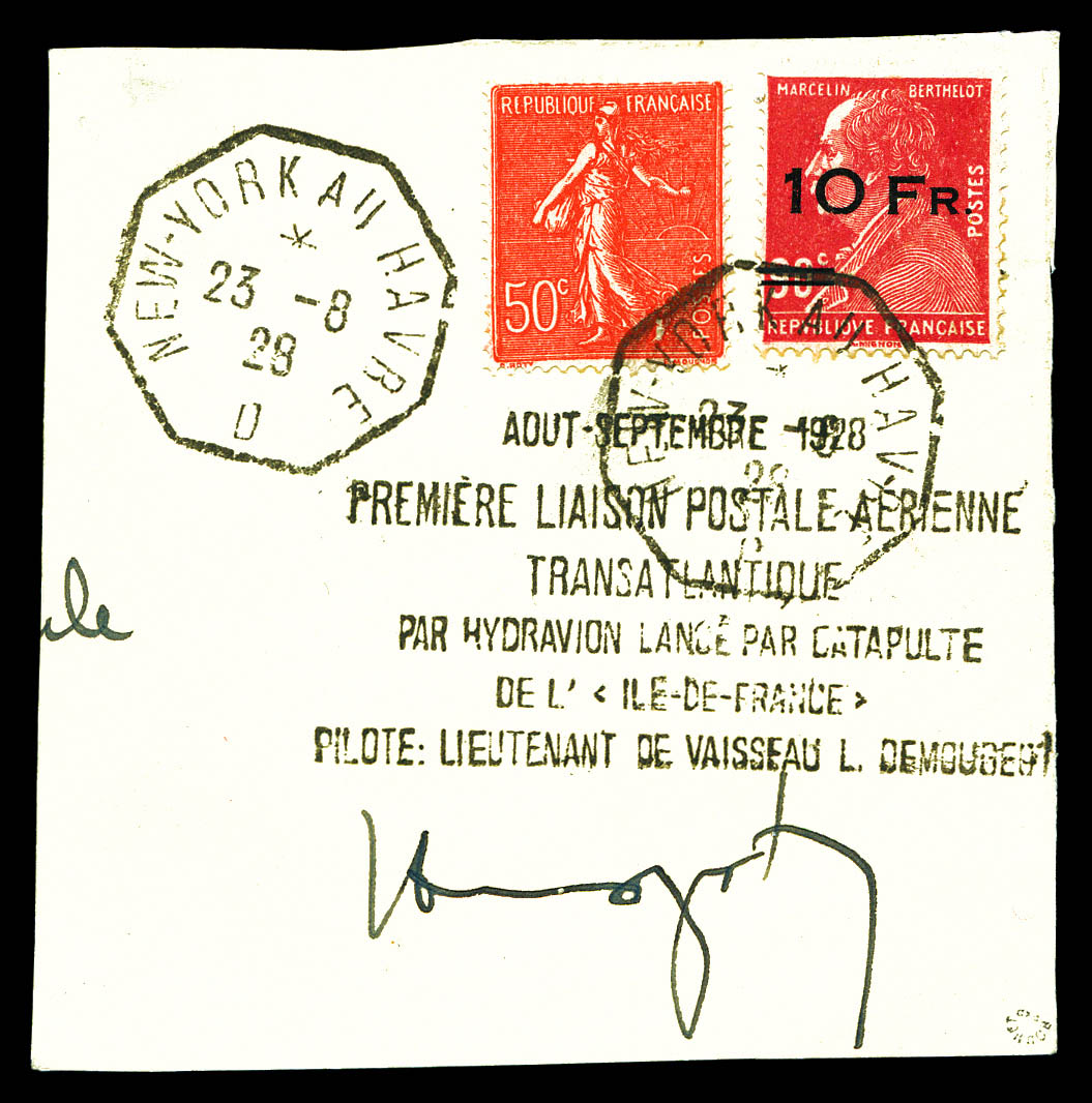 23.08.1928 avec griffe 'Première liaison Transatlantique par catapulte' et signature du Pilote Demougeot, RARETE. SUPERBE (signé Calves/Certificats) Qualité: Oblitéré (Image)