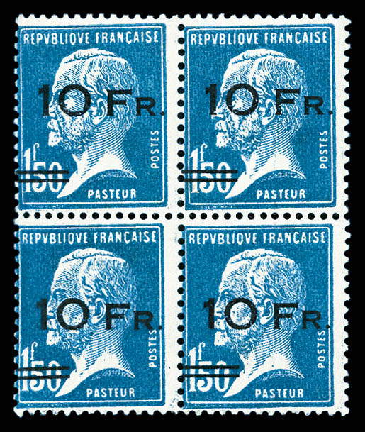 N°4b, Pasteur, 10F sur 1F50 bleu, 2 paires surcharges espacées tenant à normales en bloc de quatre, légères imperfections de gomme.