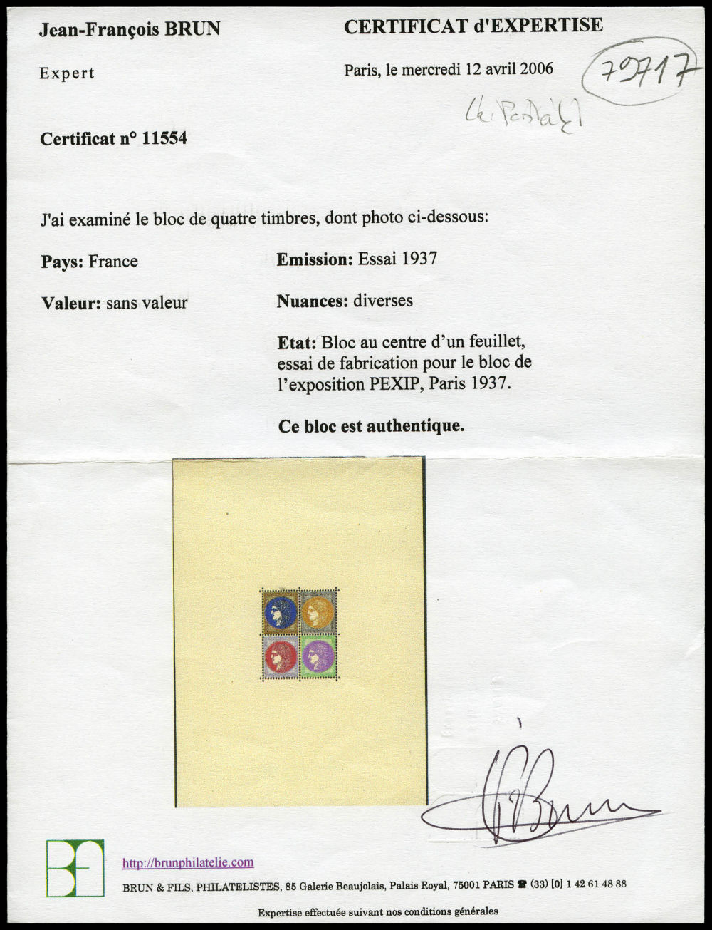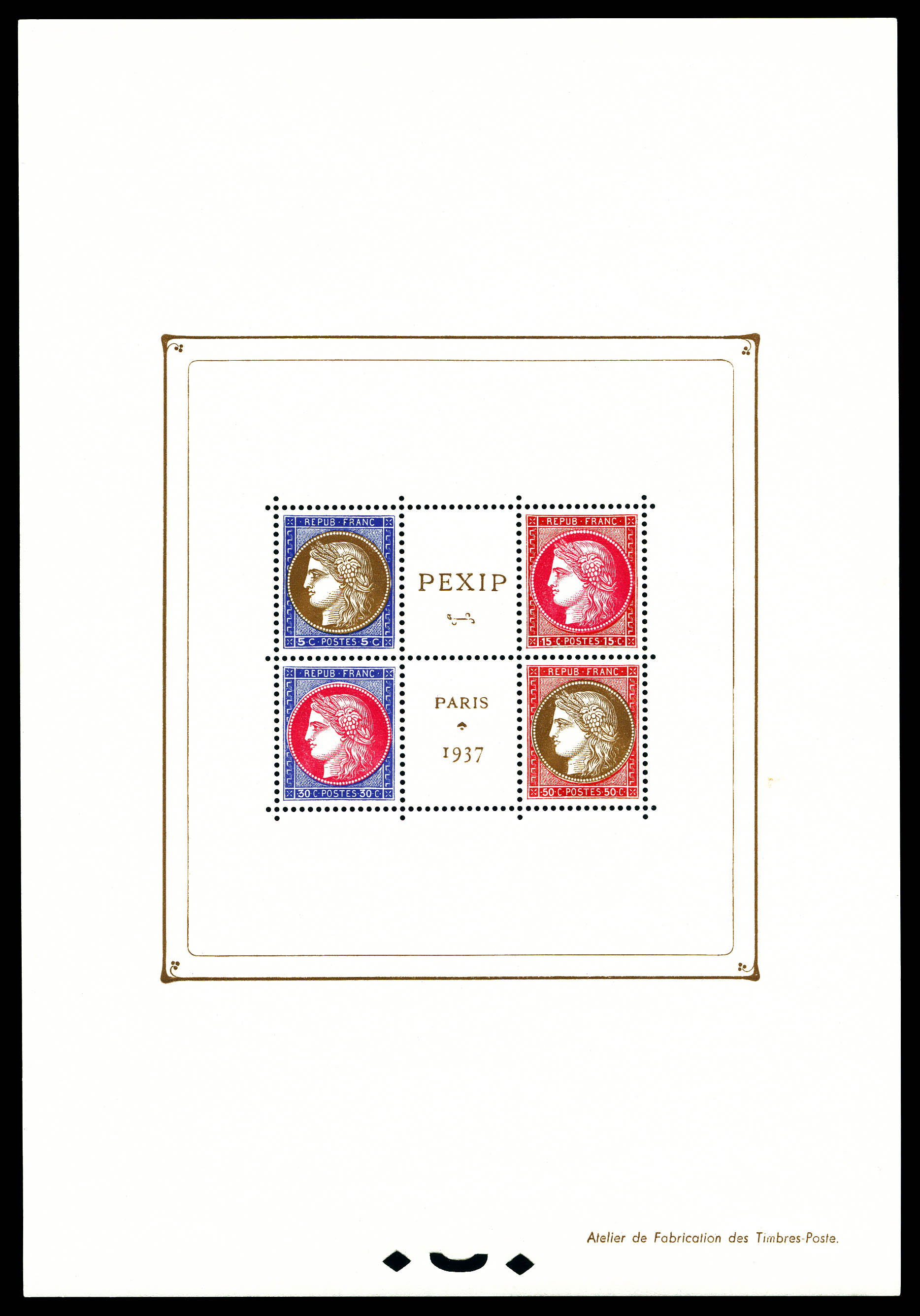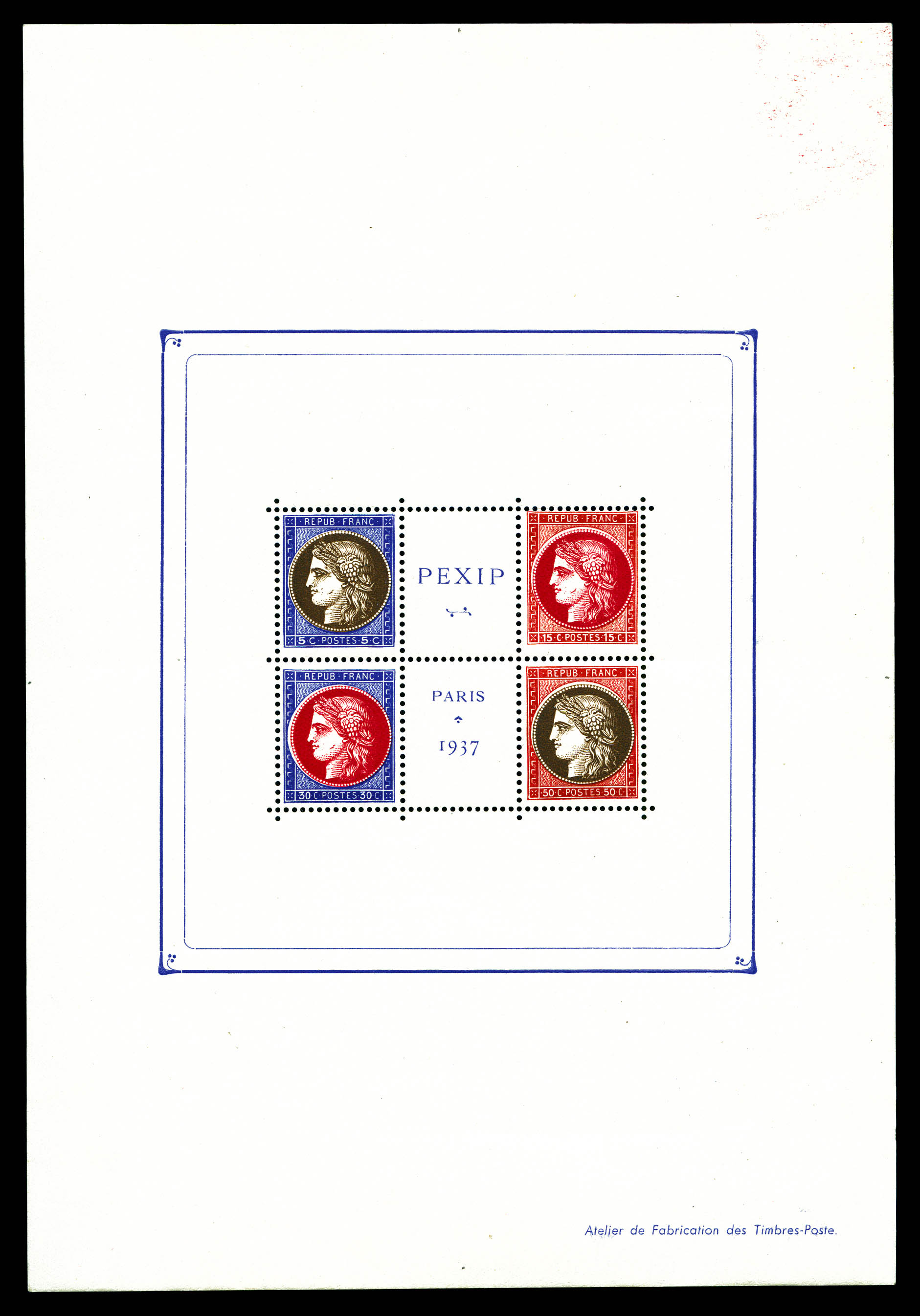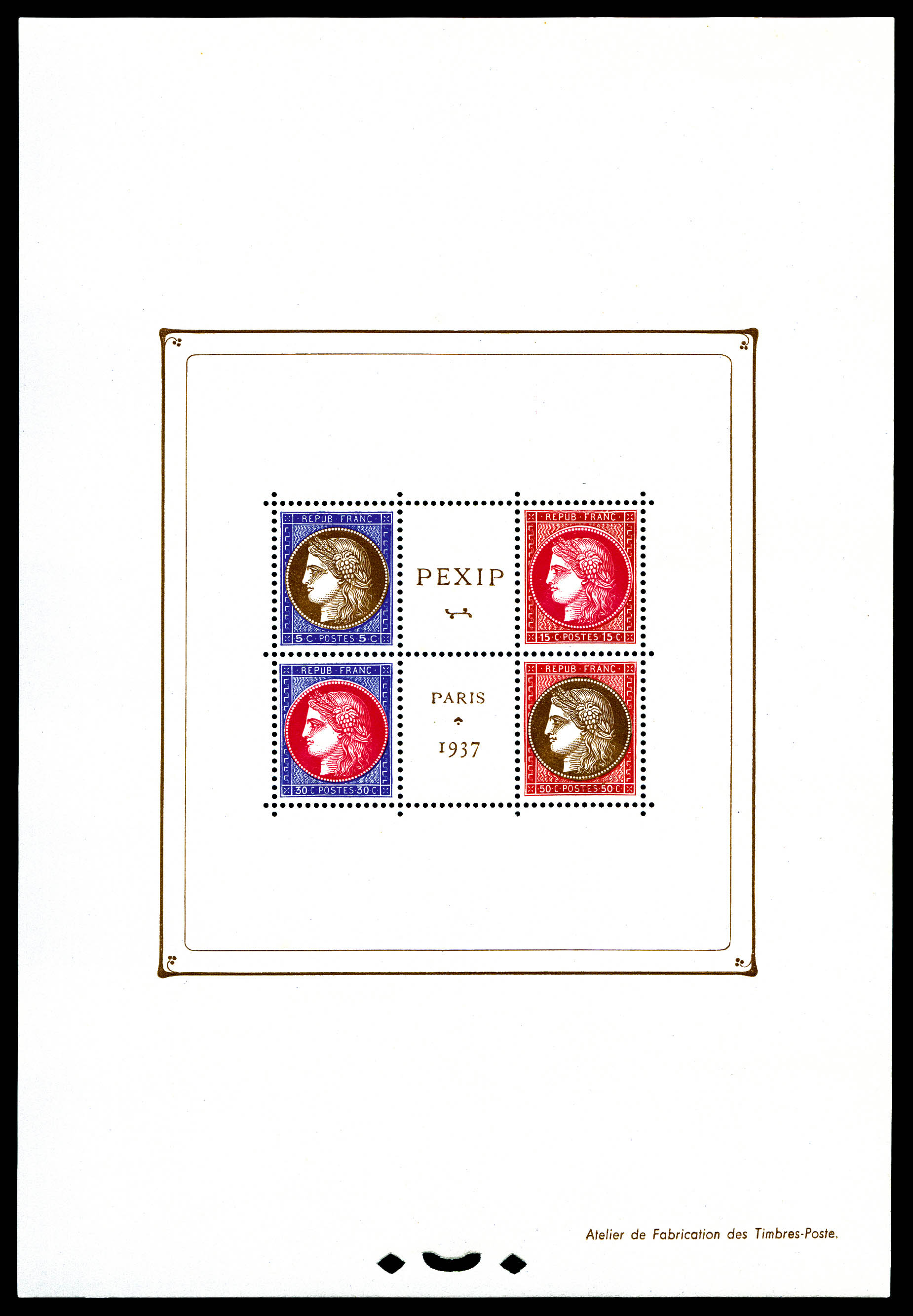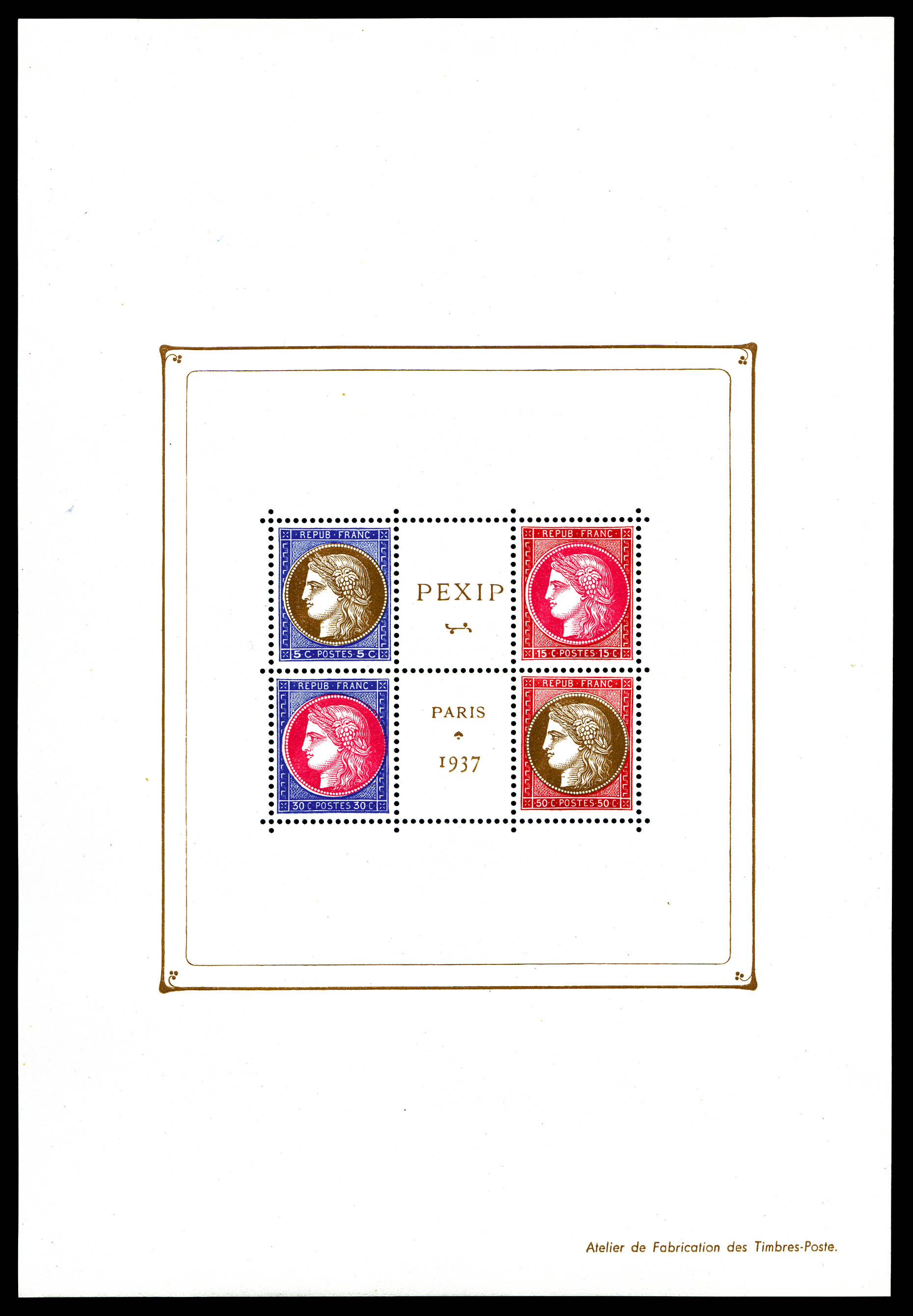 N°3d, Non émis: Exposition philatélique de 1937, bloc composé de 4 timbres dentelés avec couleurs différentes, moins de 10