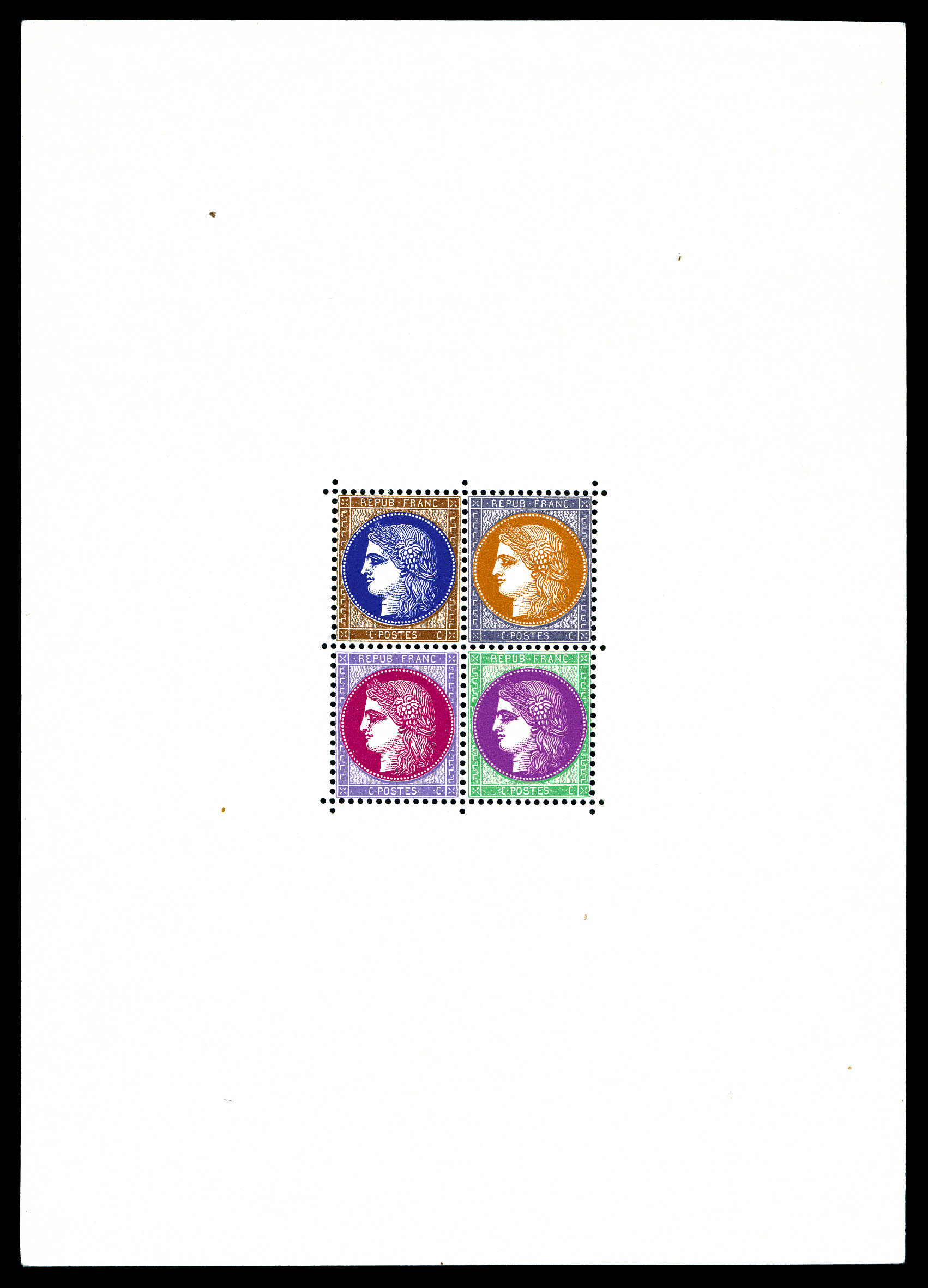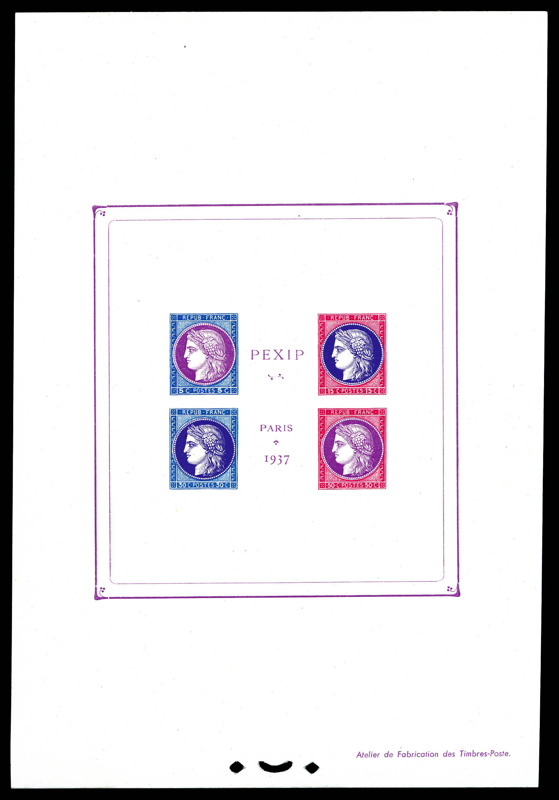 N°3, Non Emis: Exposition philatélique de 1937, bloc composé de 4 timbres non dentelés avec couleurs différentes, et cadre violet,