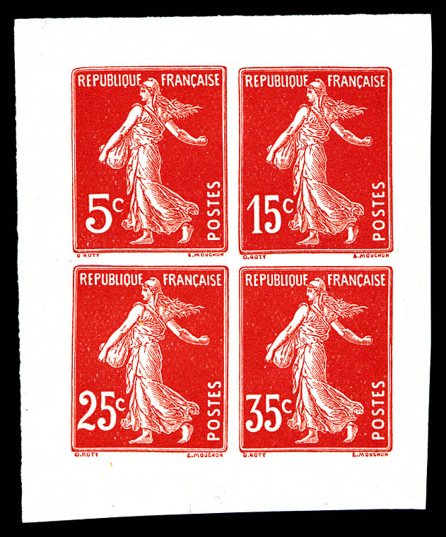 N°3, Non Emis, projet pour bloc PEXIP: Semeuse 5c + 15c + 25c + 35c, rouge en bloc de quatre non dentelé. SUPERBE. R.R. (Certificat)