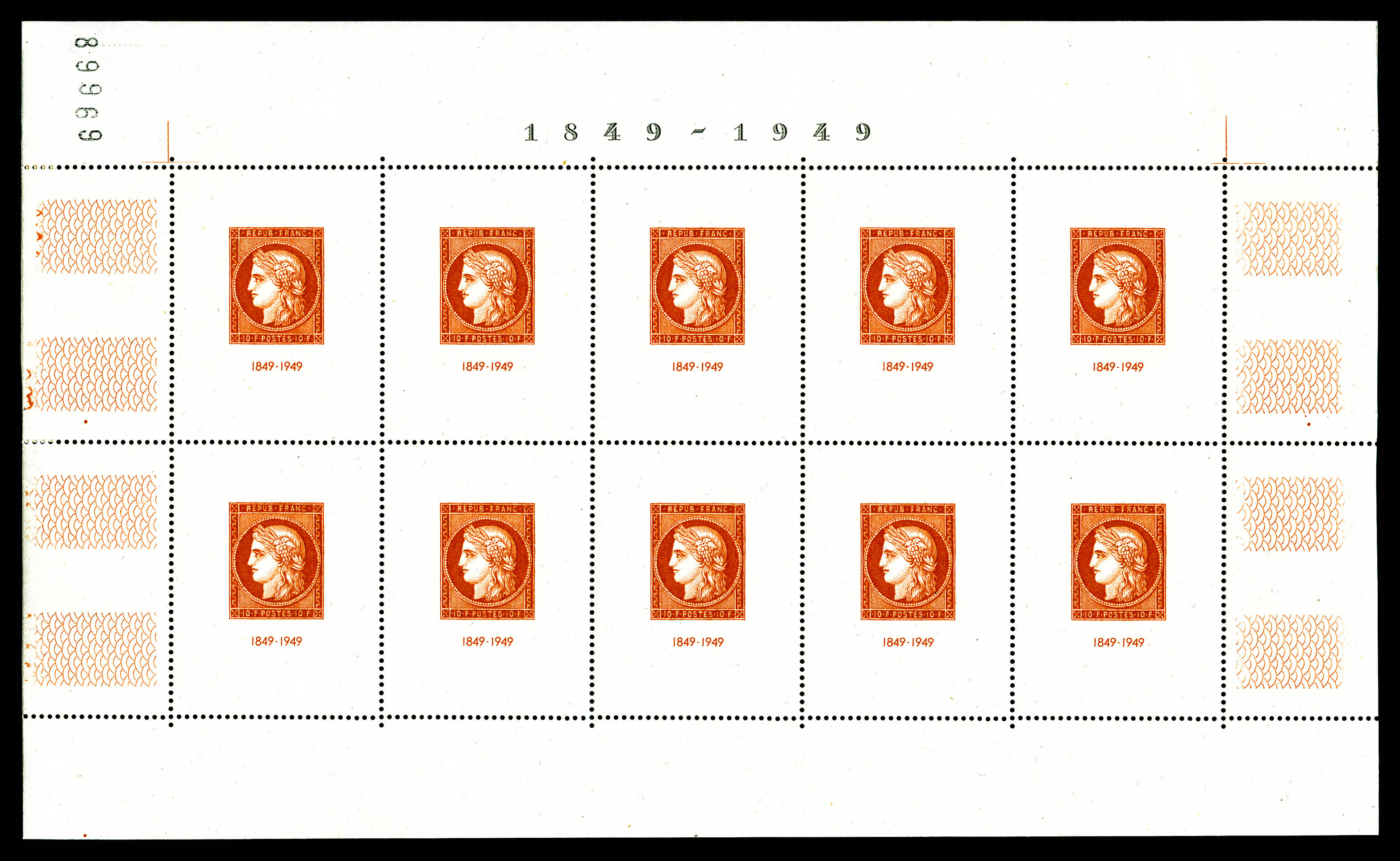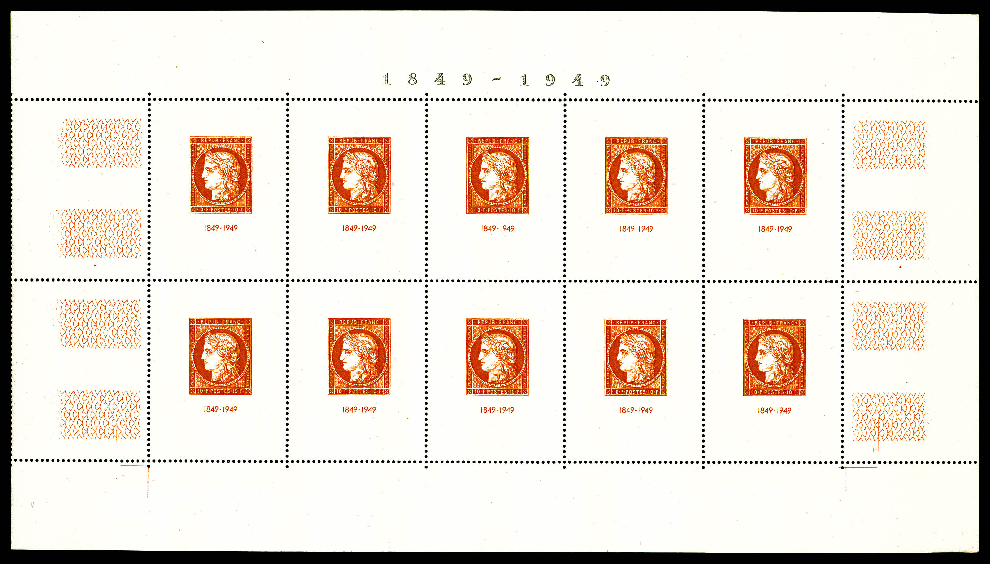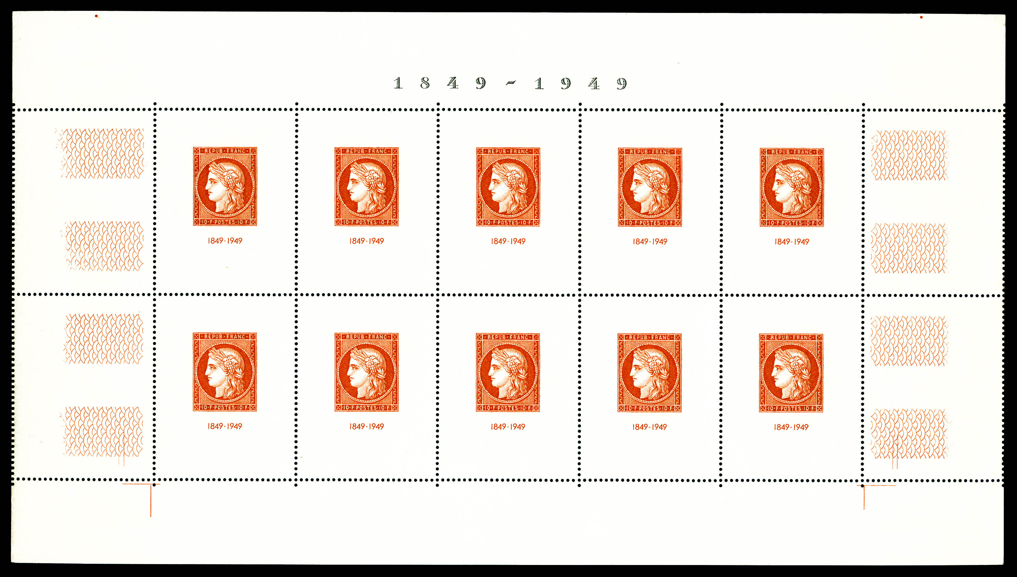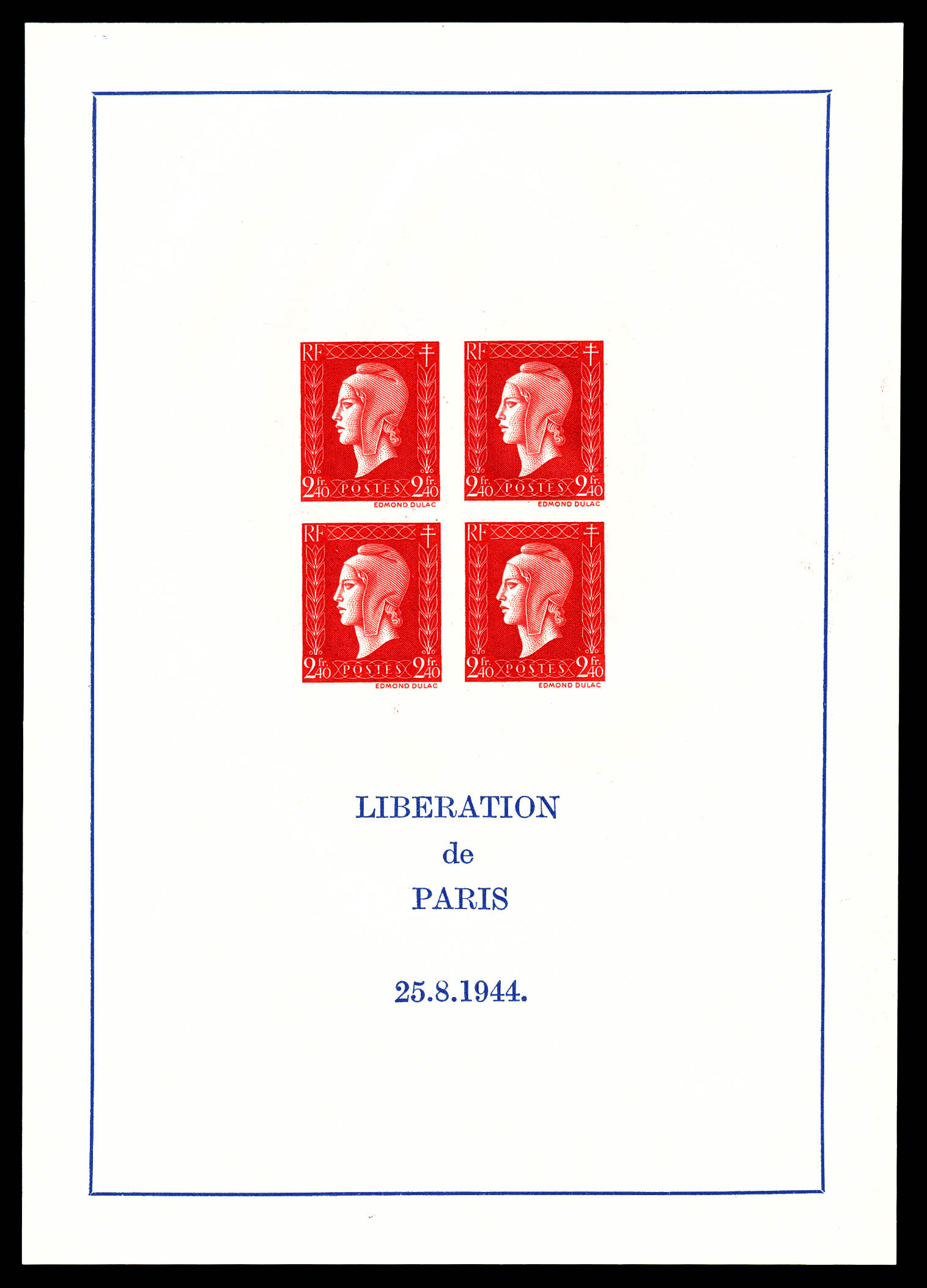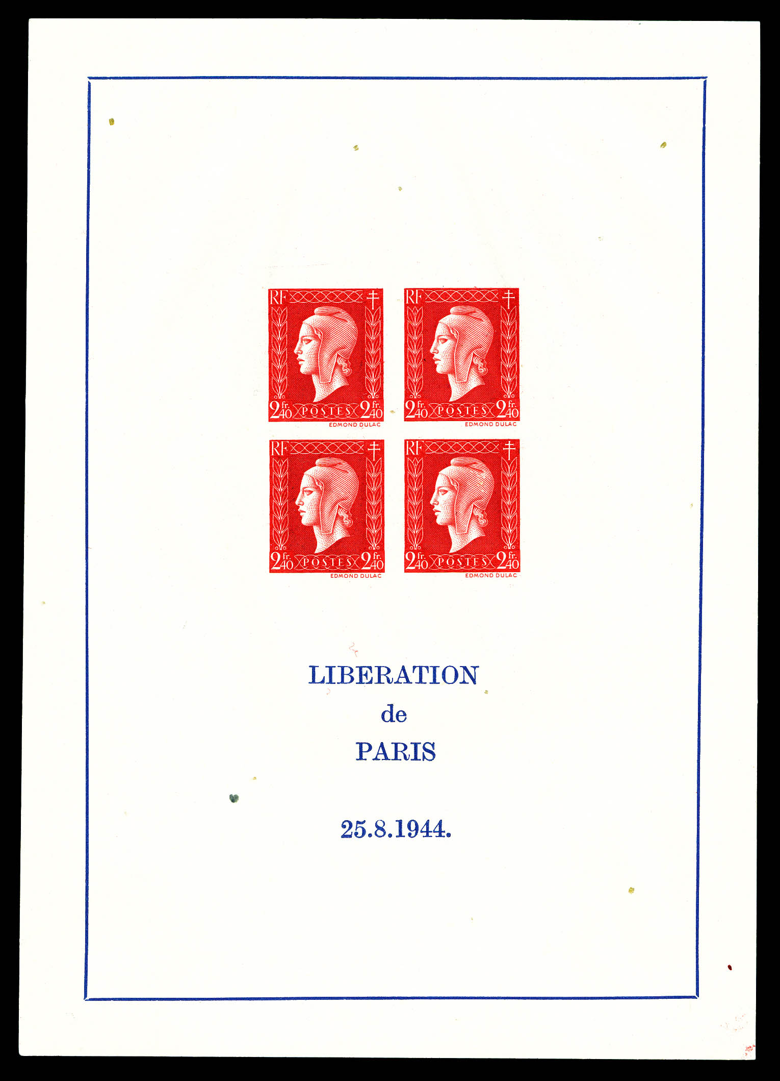 N°4, Non émis: Dulac, 2F 40 rouge en bloc de quatre sur feuillet non dentelé, qualité extraordinaire, sans pailles habituelles,