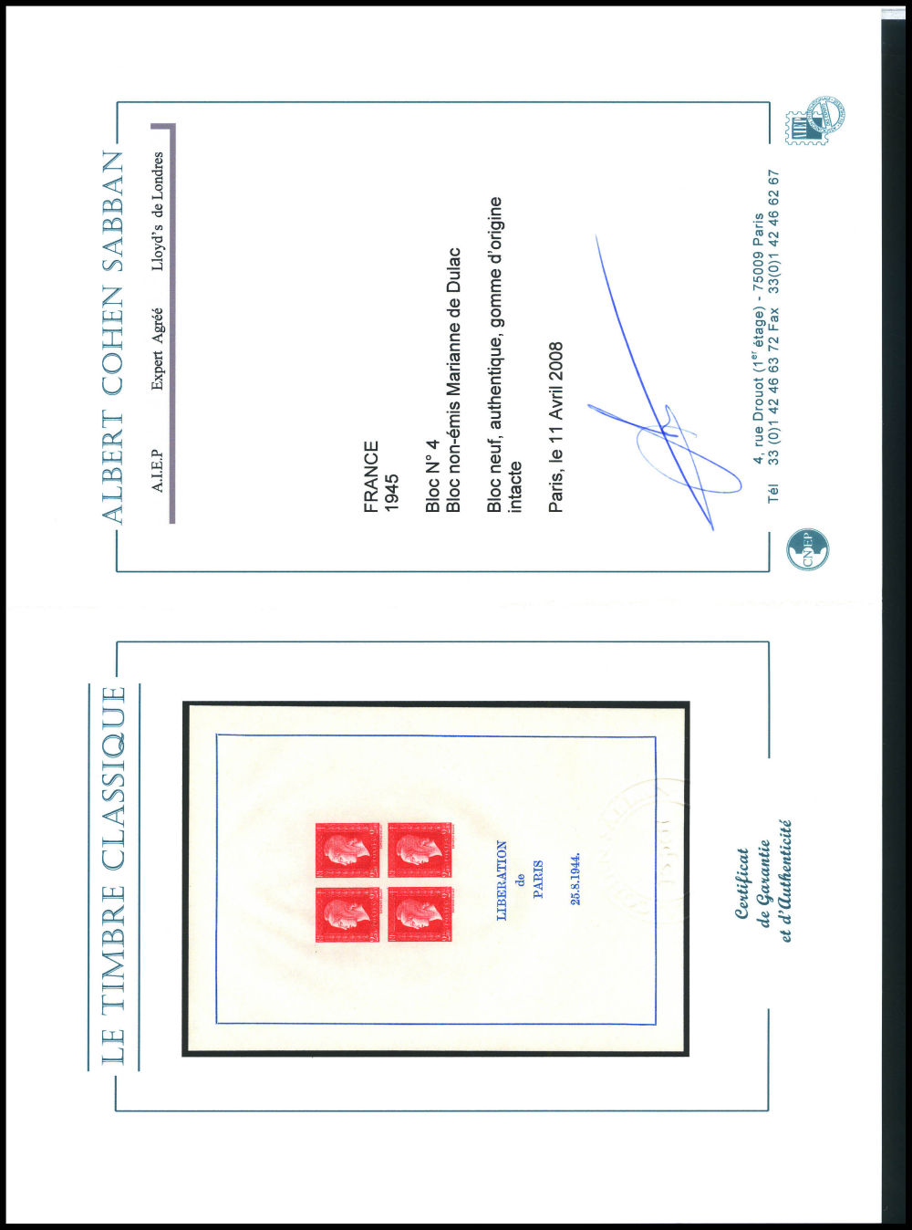 N°4, Non émis: Dulac, 2F 40 rouge en bloc de quatre sur feuillet non dentelé, SUPERBE. R.R. (signé Margues/certificat) Qualité: **