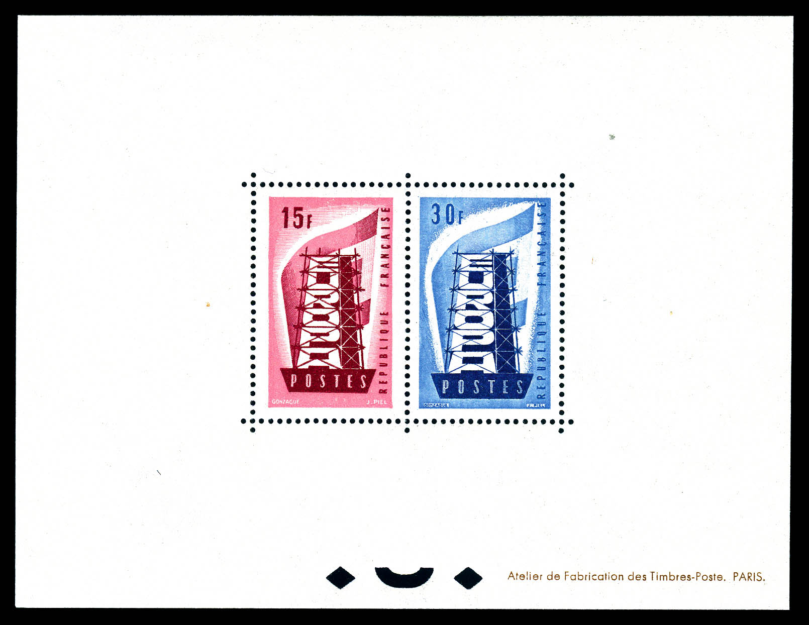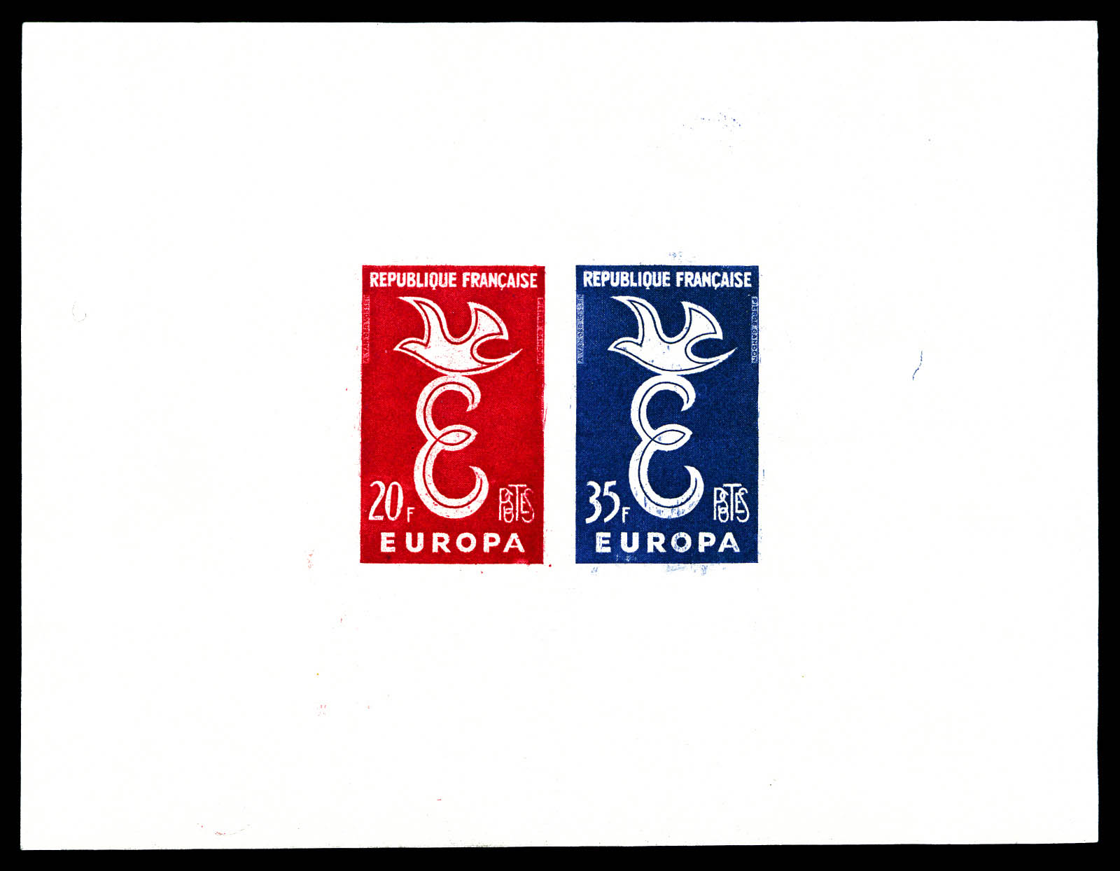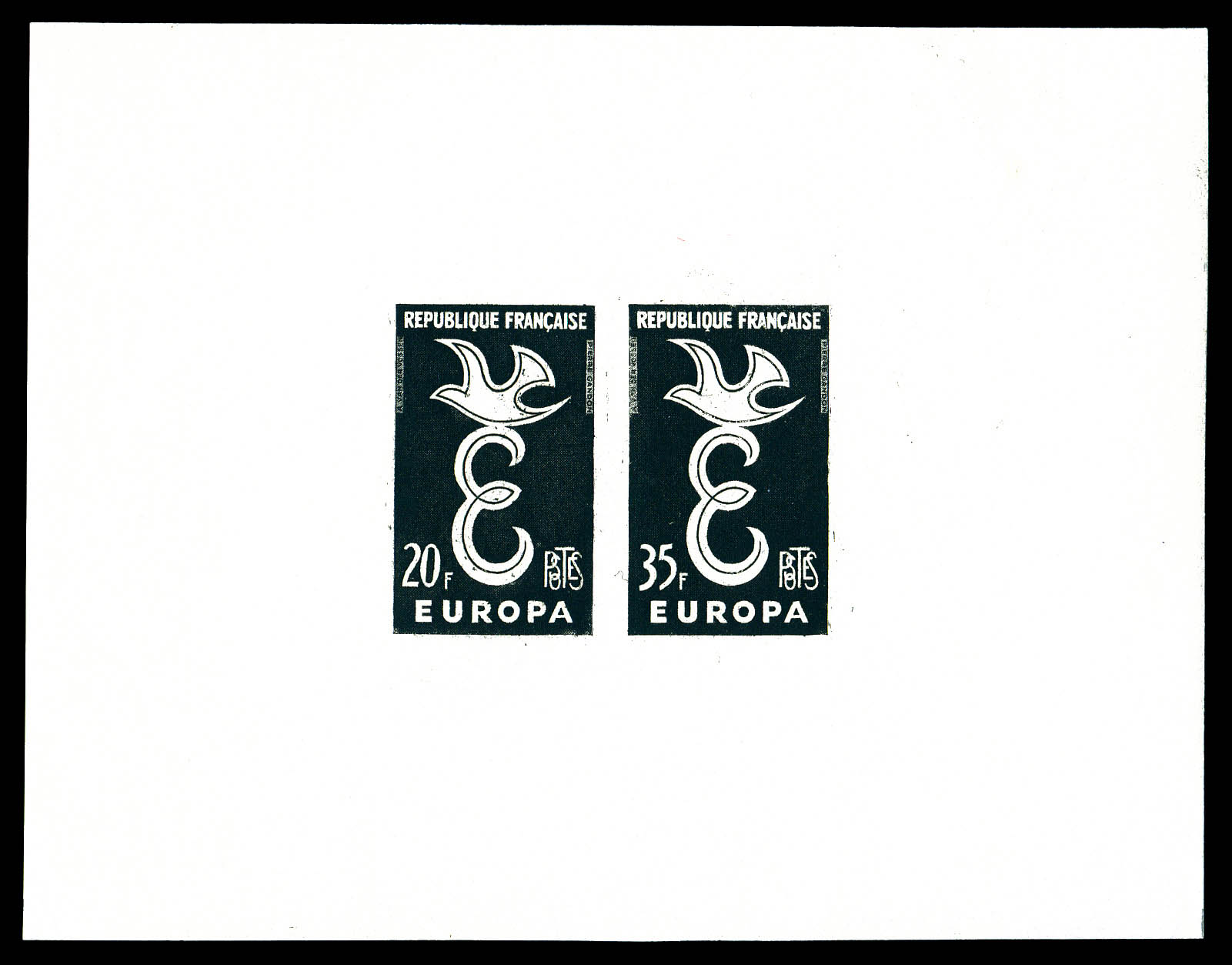 1475 nh imageN°1173/1174, Paire Europa 1958, Colombe de la Paix, feuillet gommé en noir avec présentation collective des 2 timbres, graveur Pierre Gandon, 2ème pièce vue et la plus belle connue, GRANDE RARETEE. SUPERBE (certificat). Qualité: ** (Image)