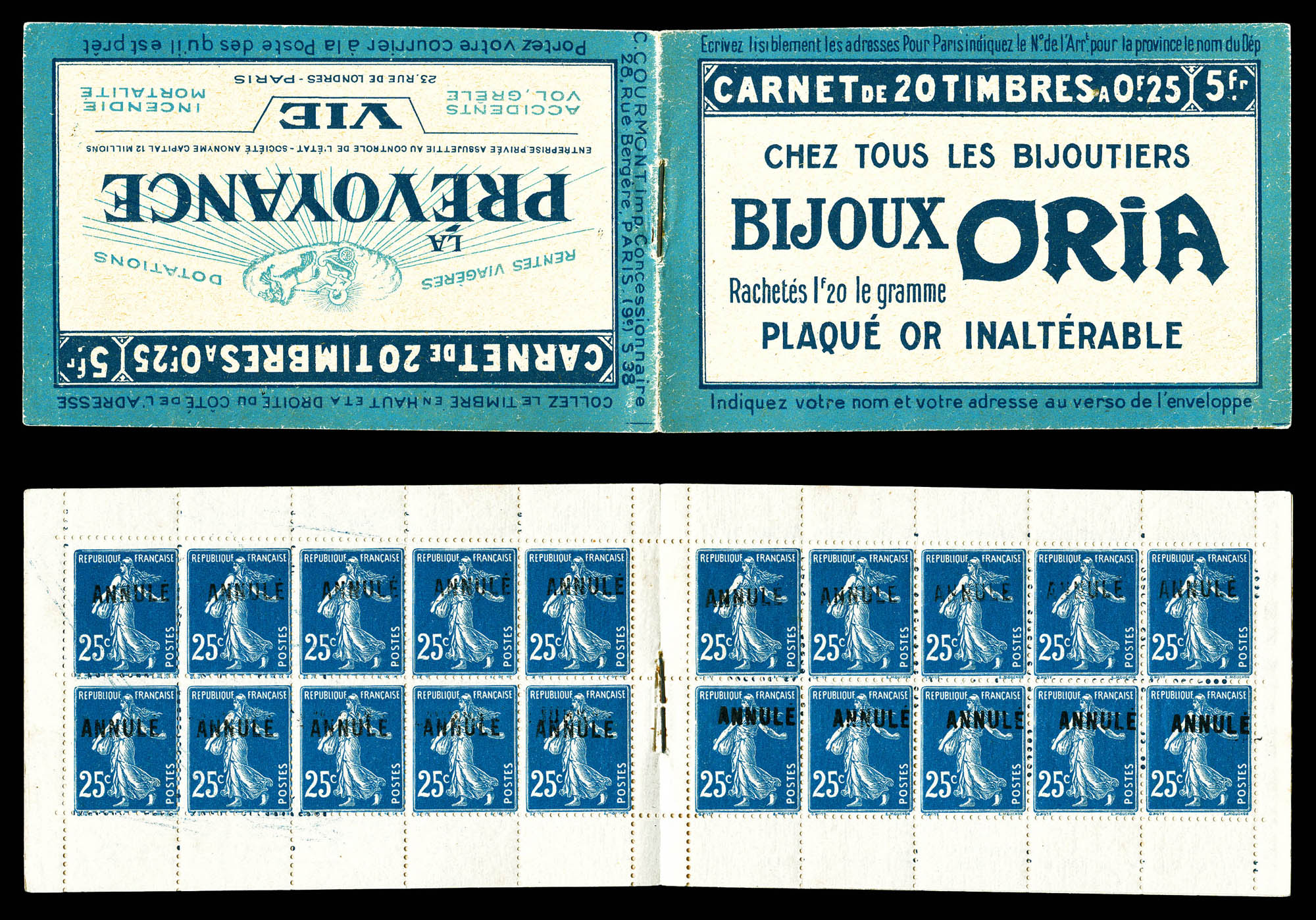 N°140-CA2, Série 38-A, LA PREVOYANCE VIE, 25c bleu surchargés 'ANNULE'. SUP (signé Brun/certificat) Qualité: ** (Image) (imagea)