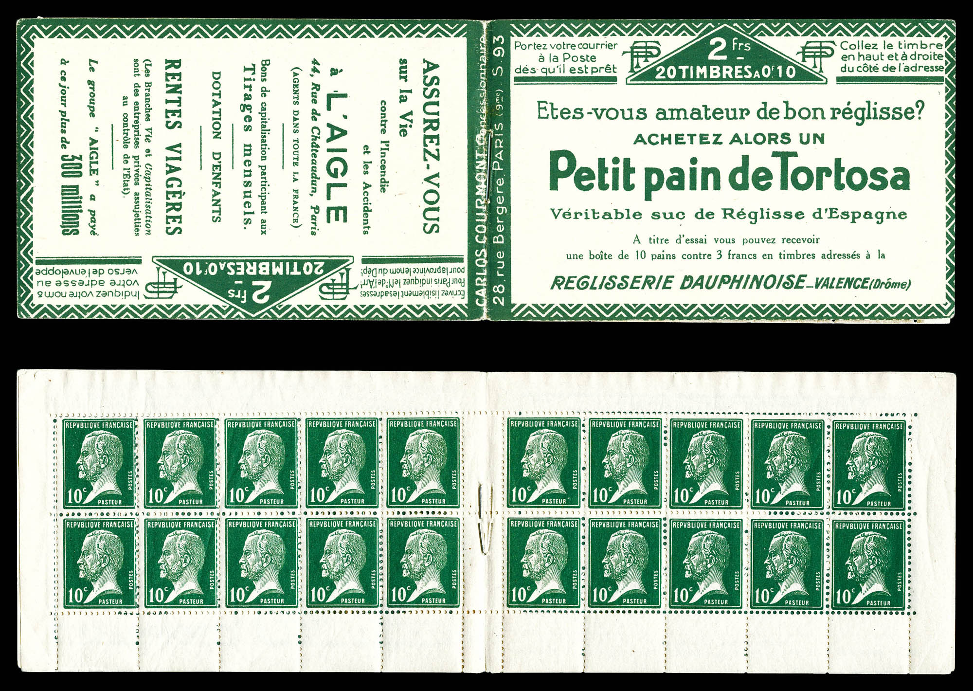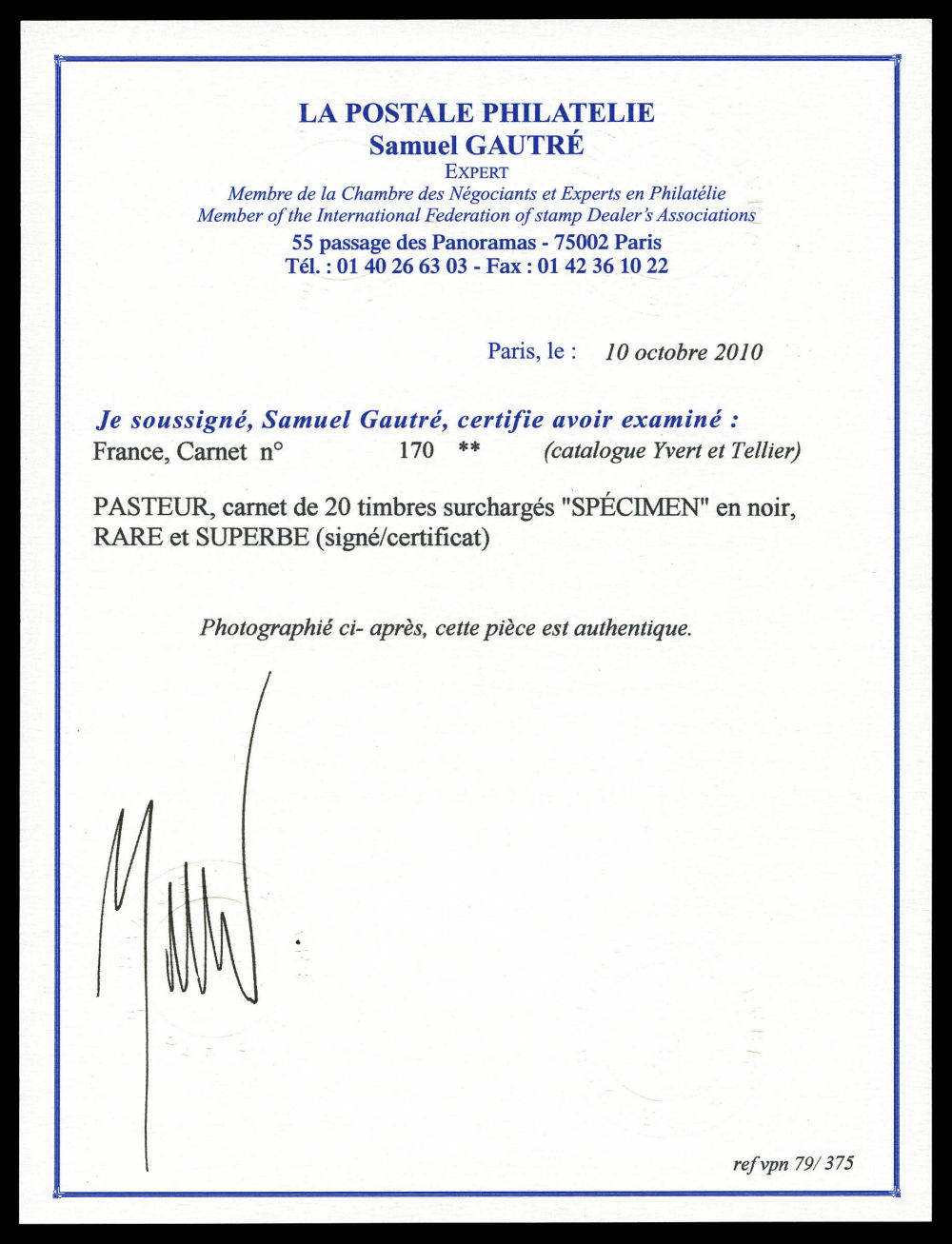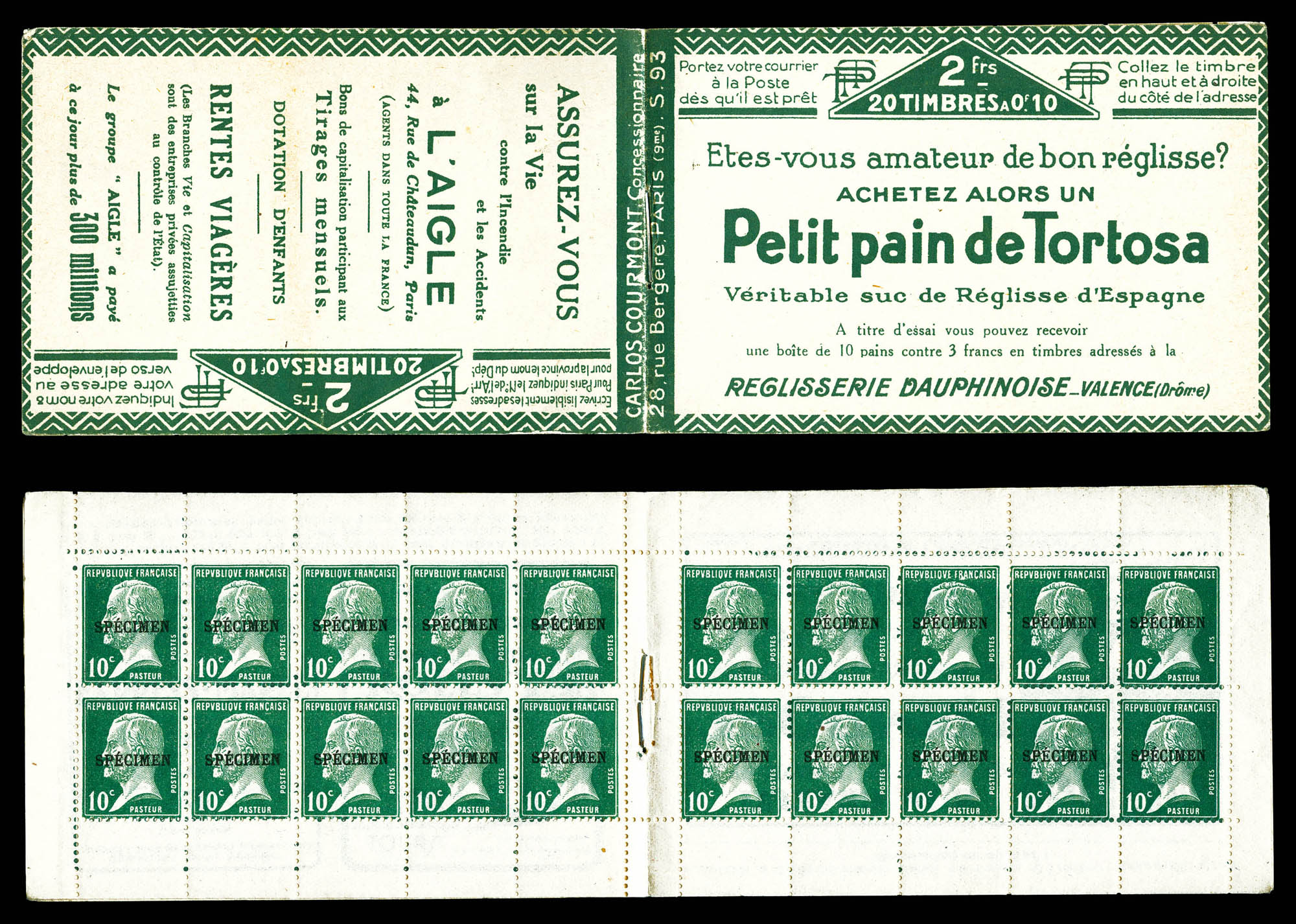 N°170-CA 1, Série 93-A, PASTEUR, carnet de 20 timbres surchargés 'SPÉCIMEN' en noir, RARE et SUPERBE (signé Calves/certificat)