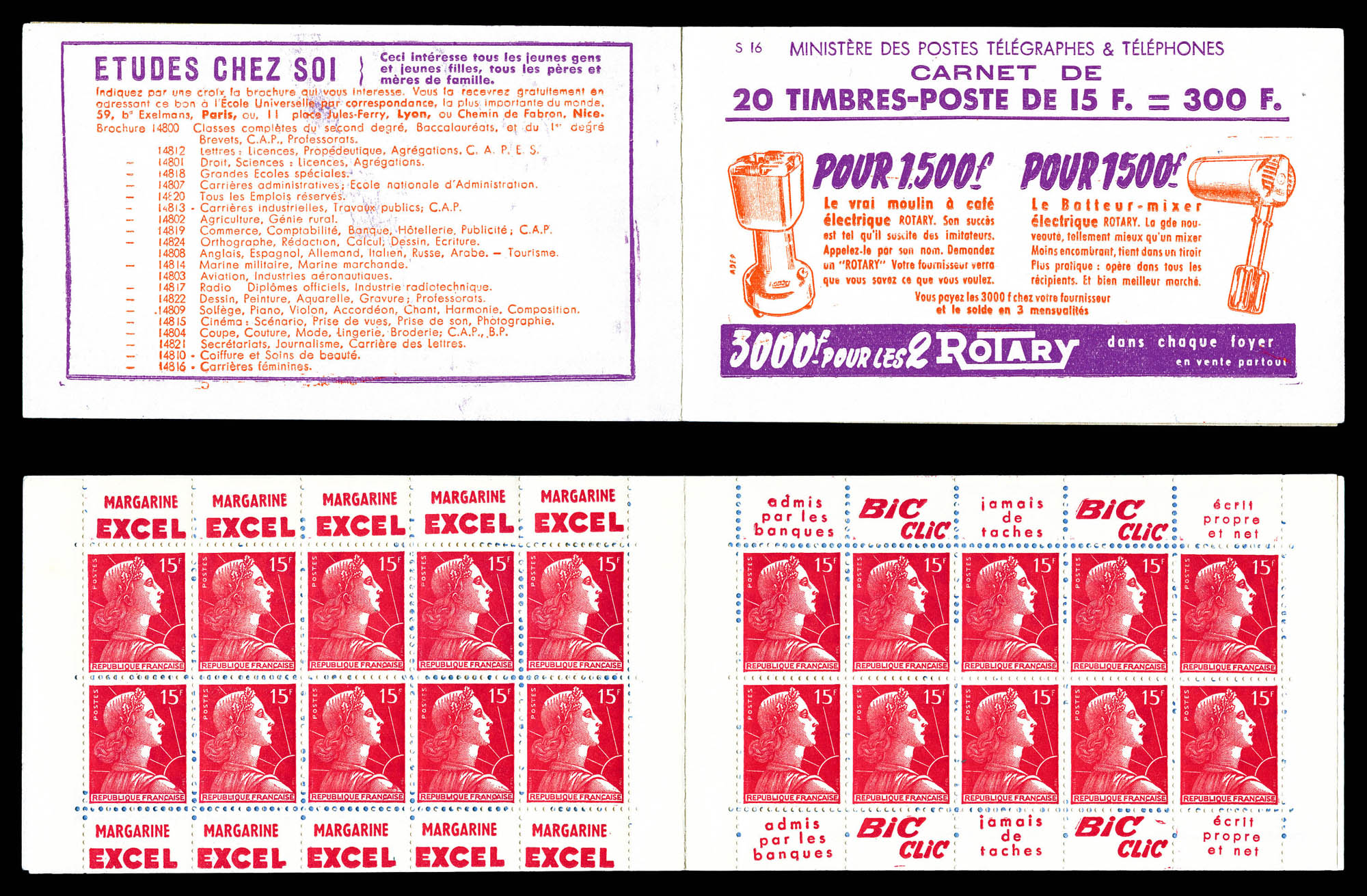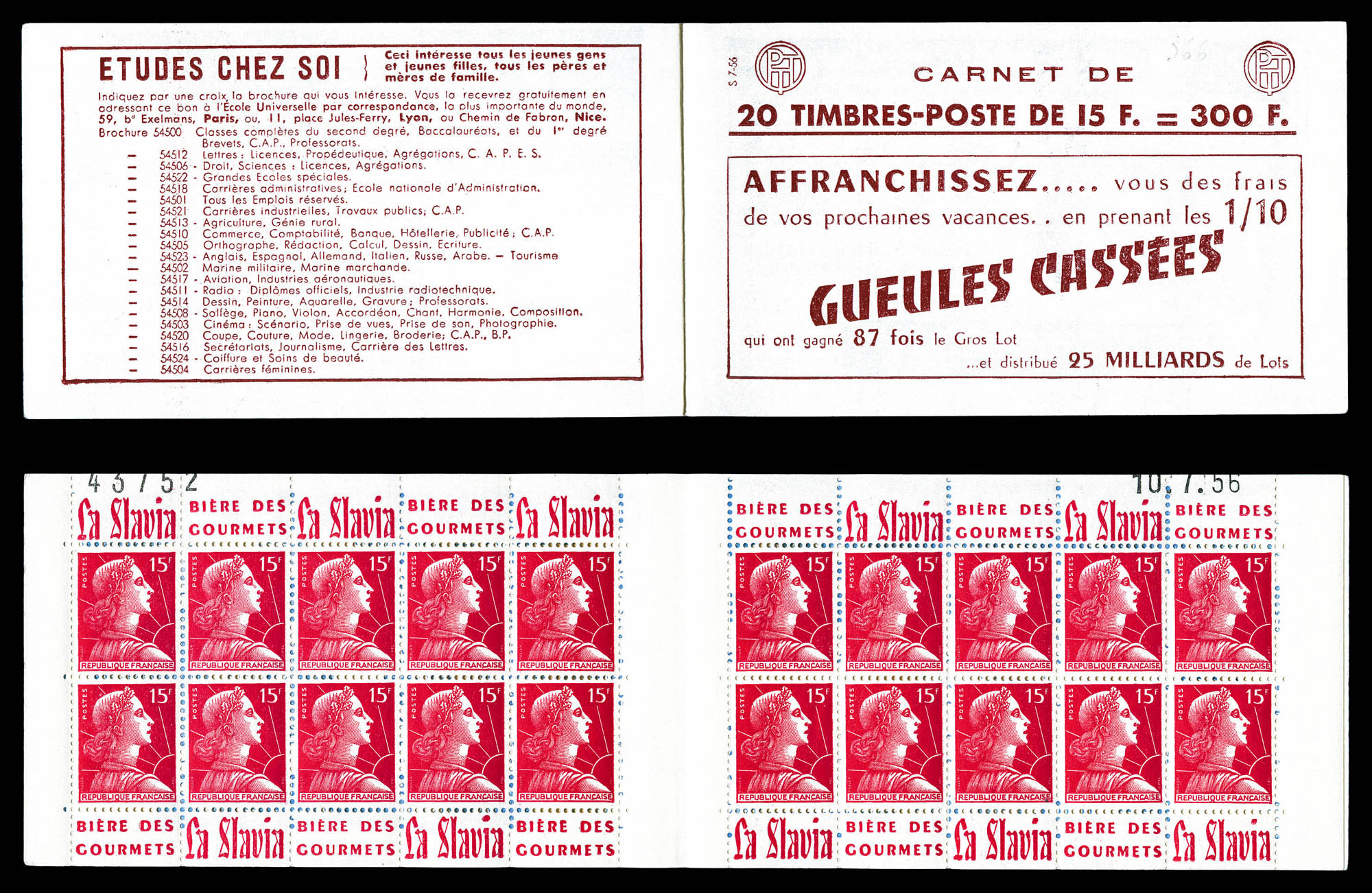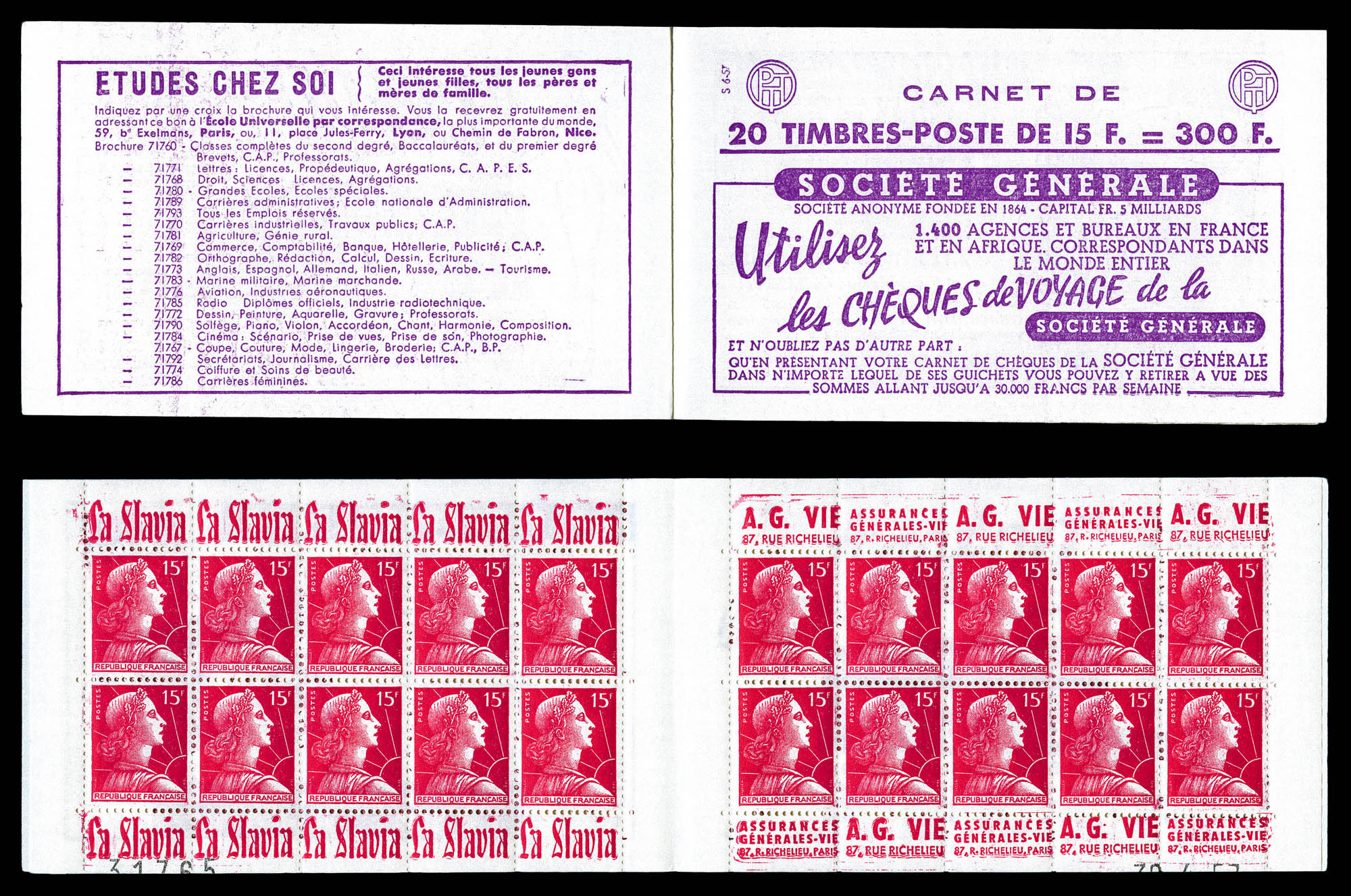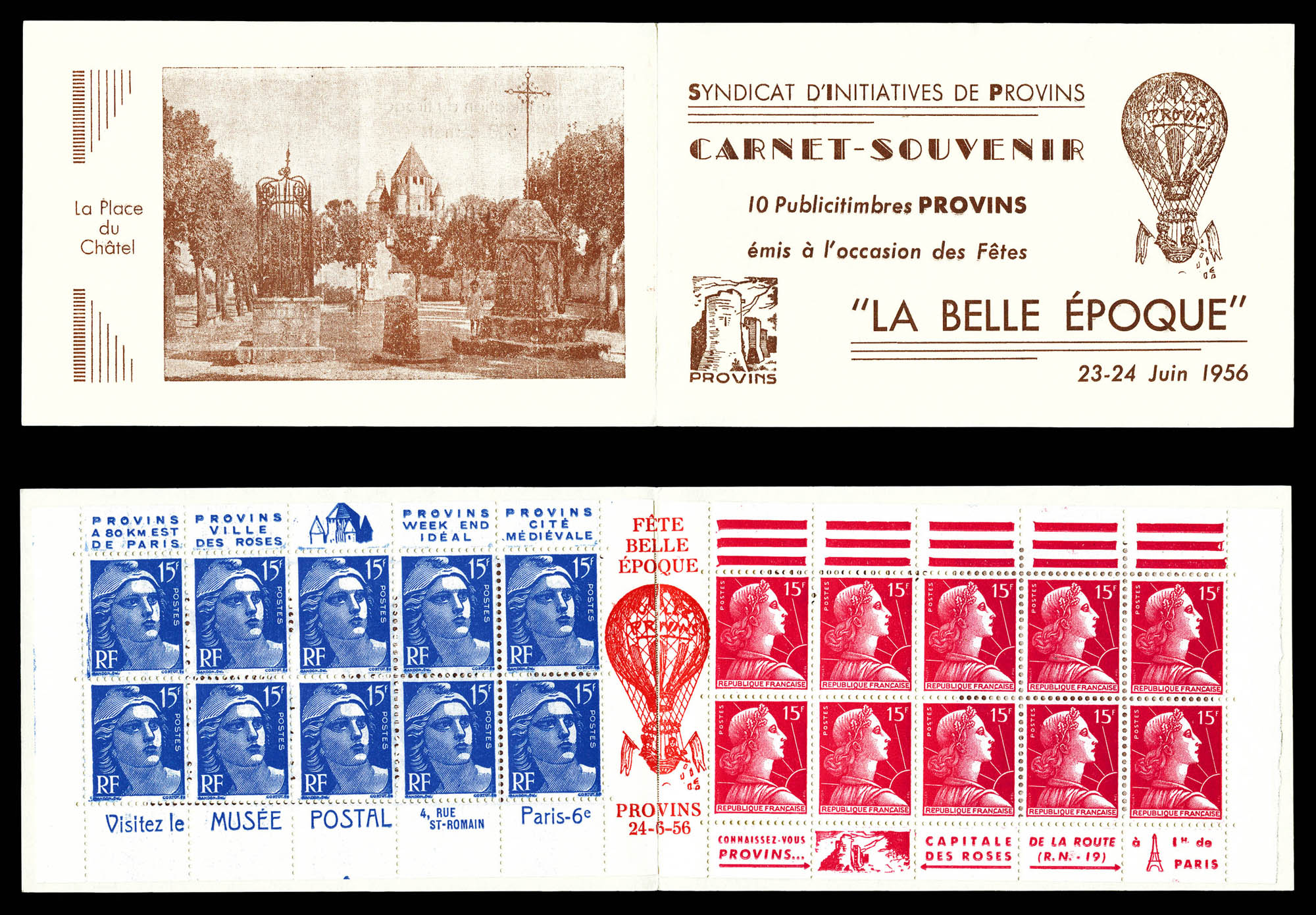 PROVINS, carnet de 20 timbres MIXTE: 10 exemplaires du 15f GANDON (feuillet de gauche) et 10 exemplaires du 15f MULLER (feuillet de