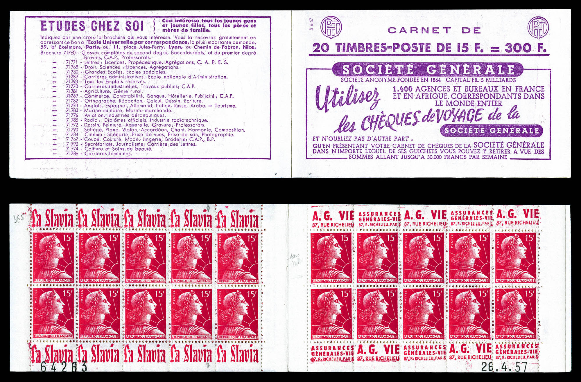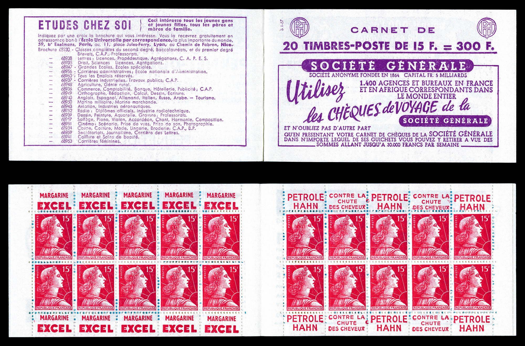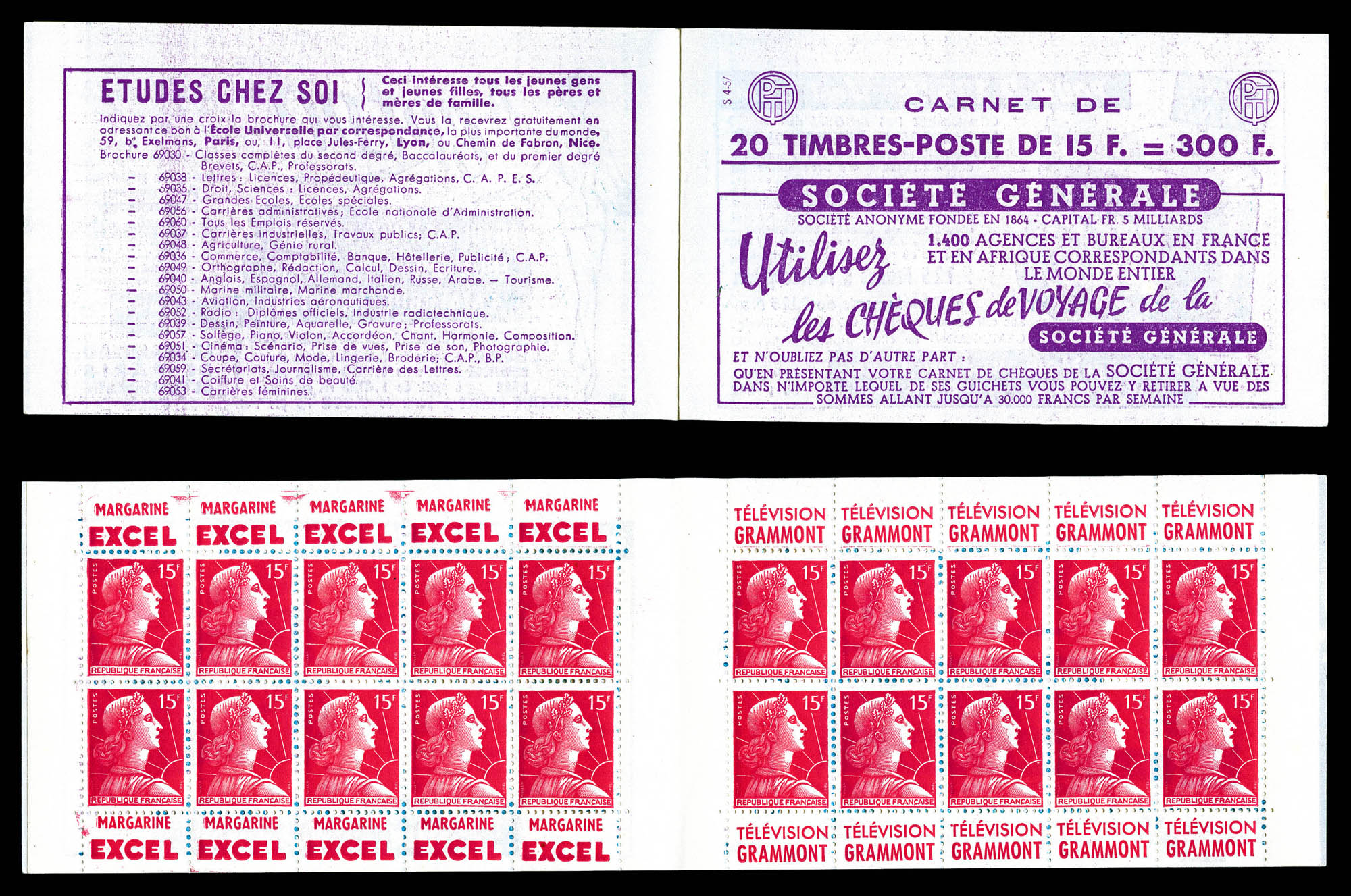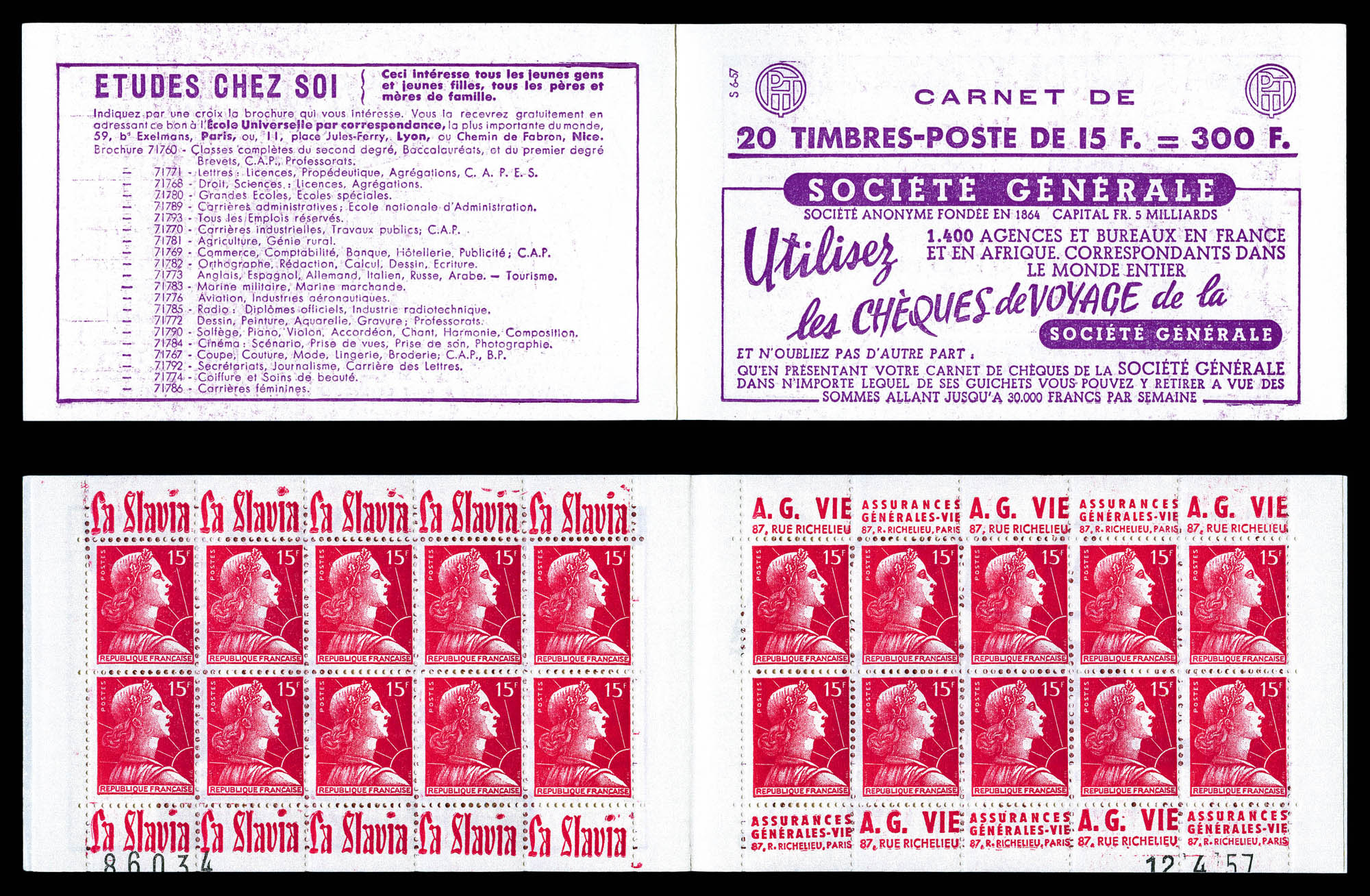PROVINS, carnet de 20 timbres MIXTE: 10 exemplaires du 15f GANDON (feuillet de gauche) et 10 exemplaires du 15f MULLER (feuillet de