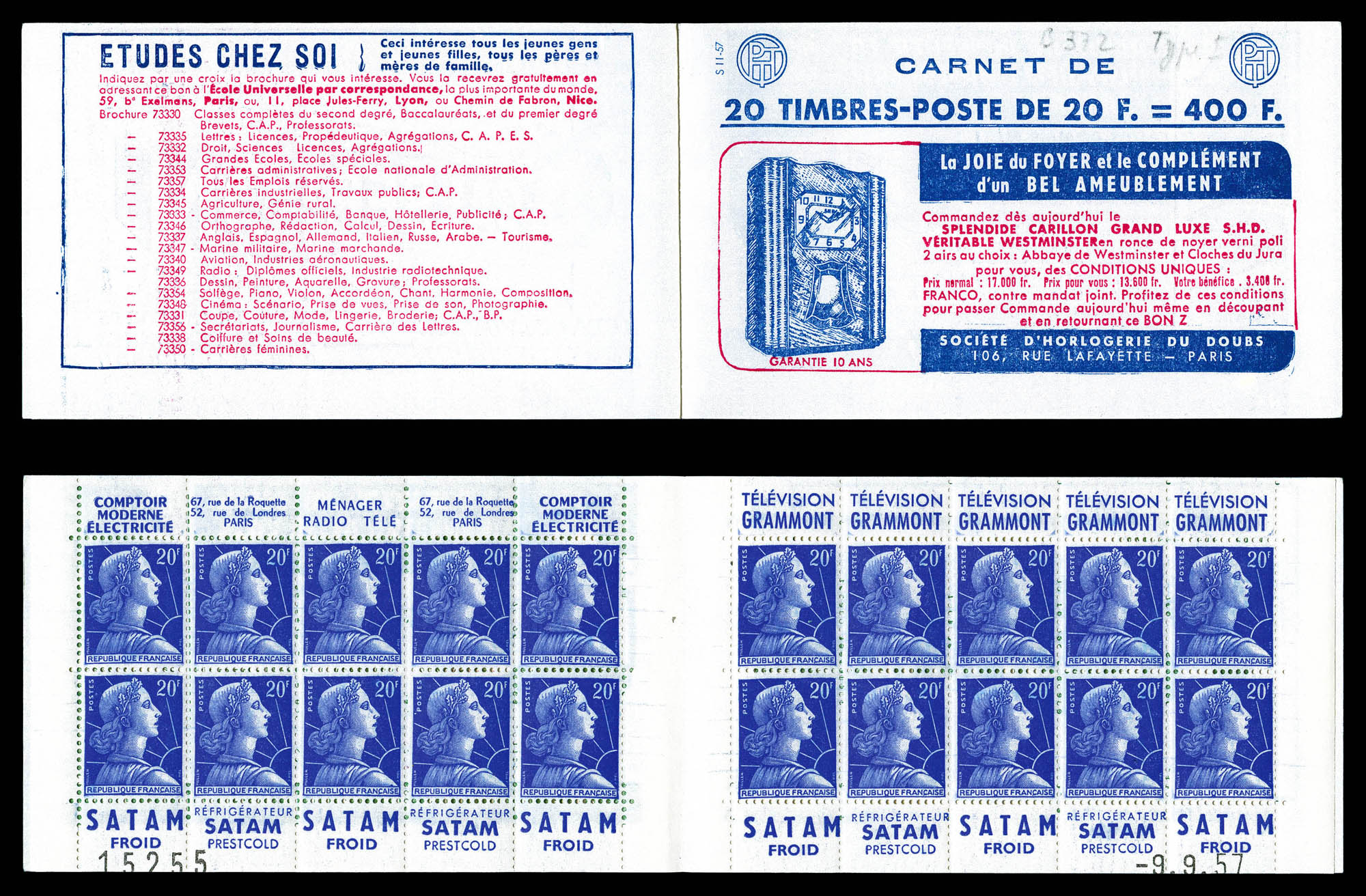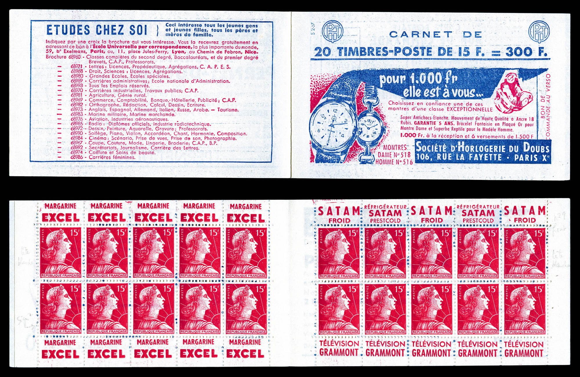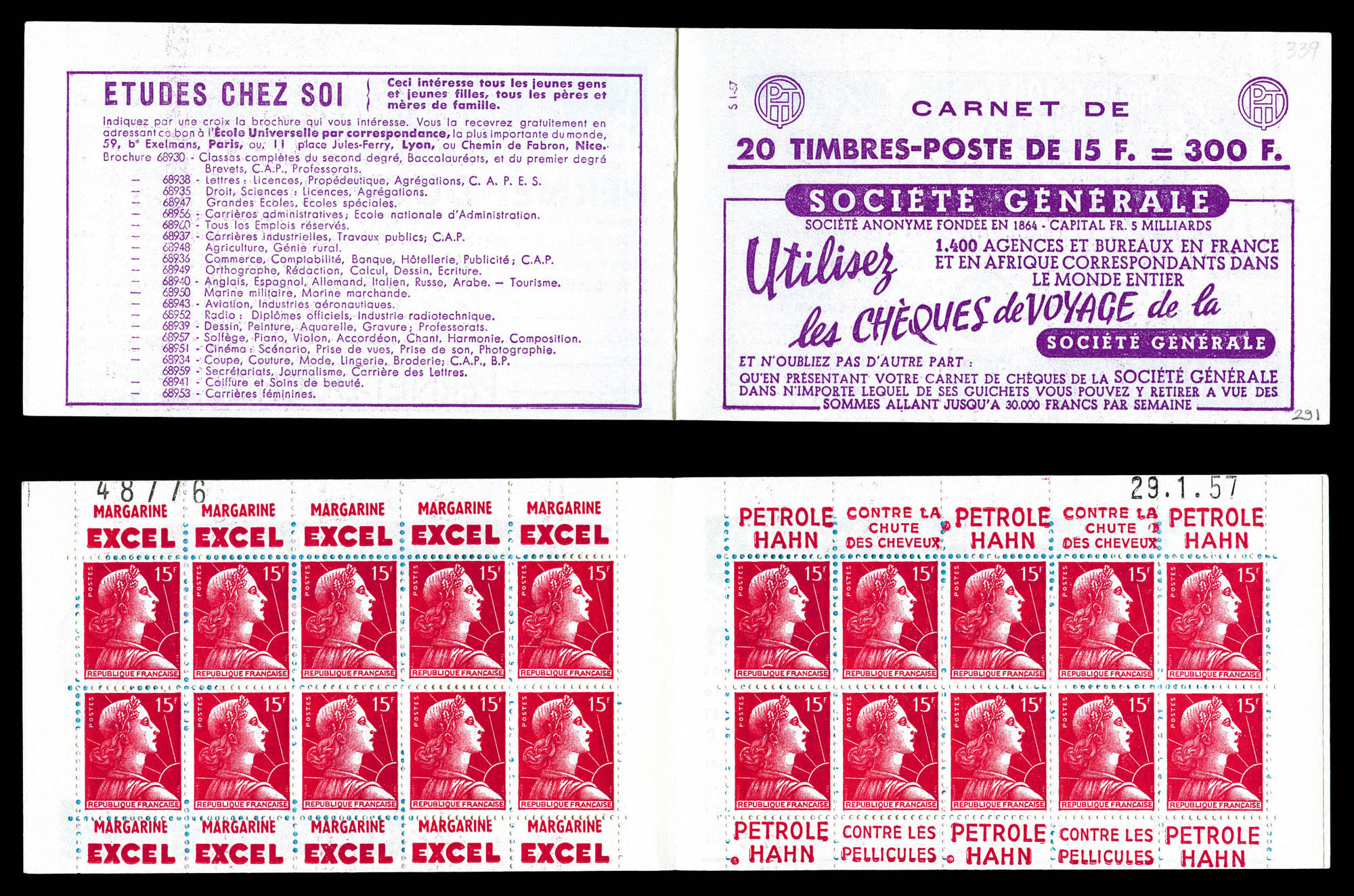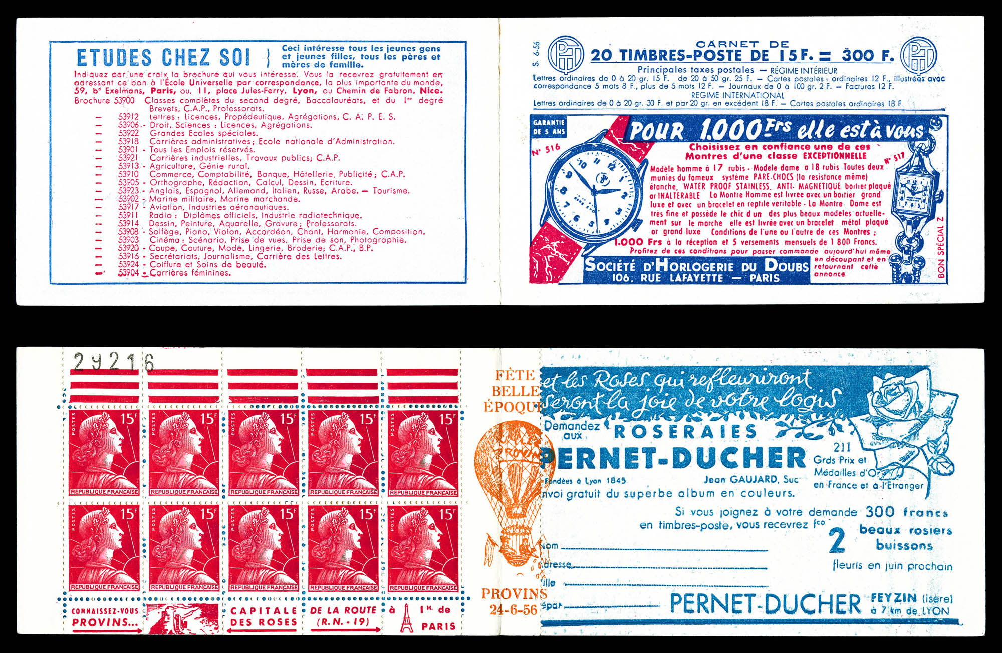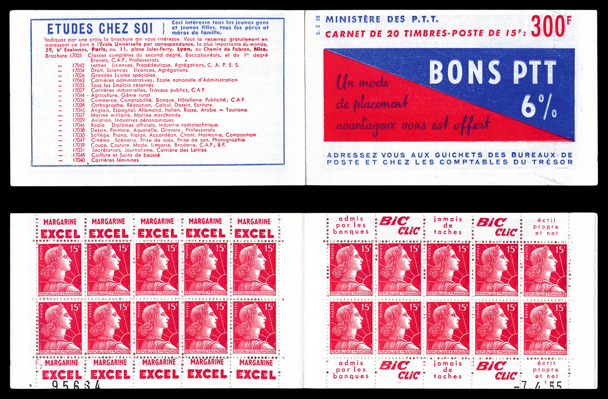 PROVINS, carnet de 20 timbres MIXTE: 10 exemplaires du 15f GANDON (feuillet de gauche) et 10 exemplaires du 15f MULLER (feuillet de