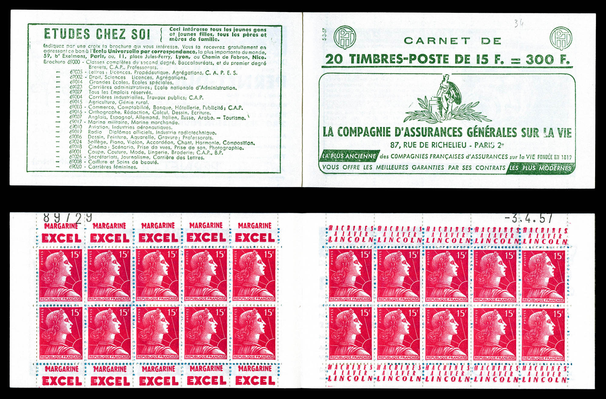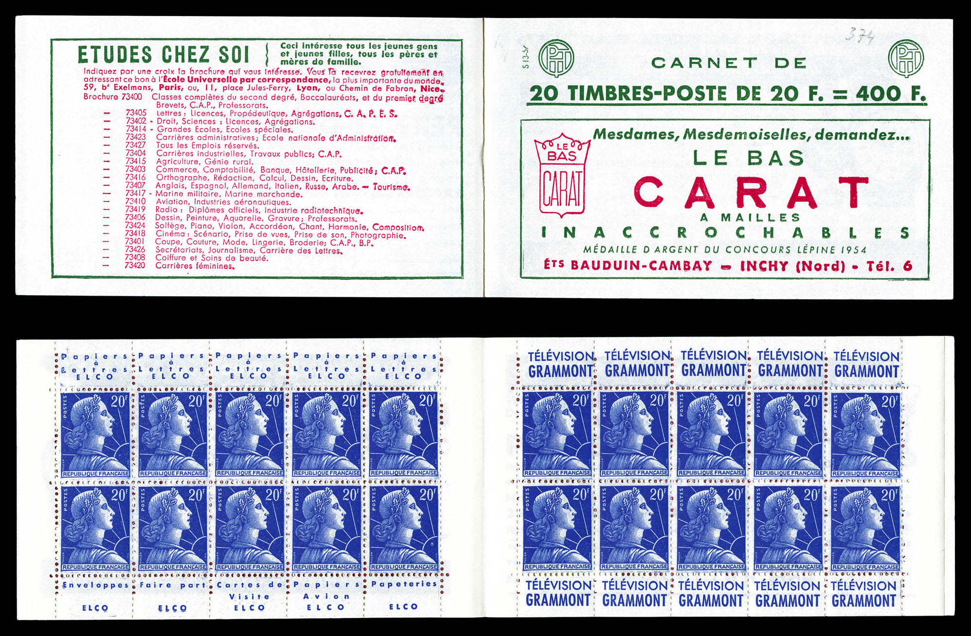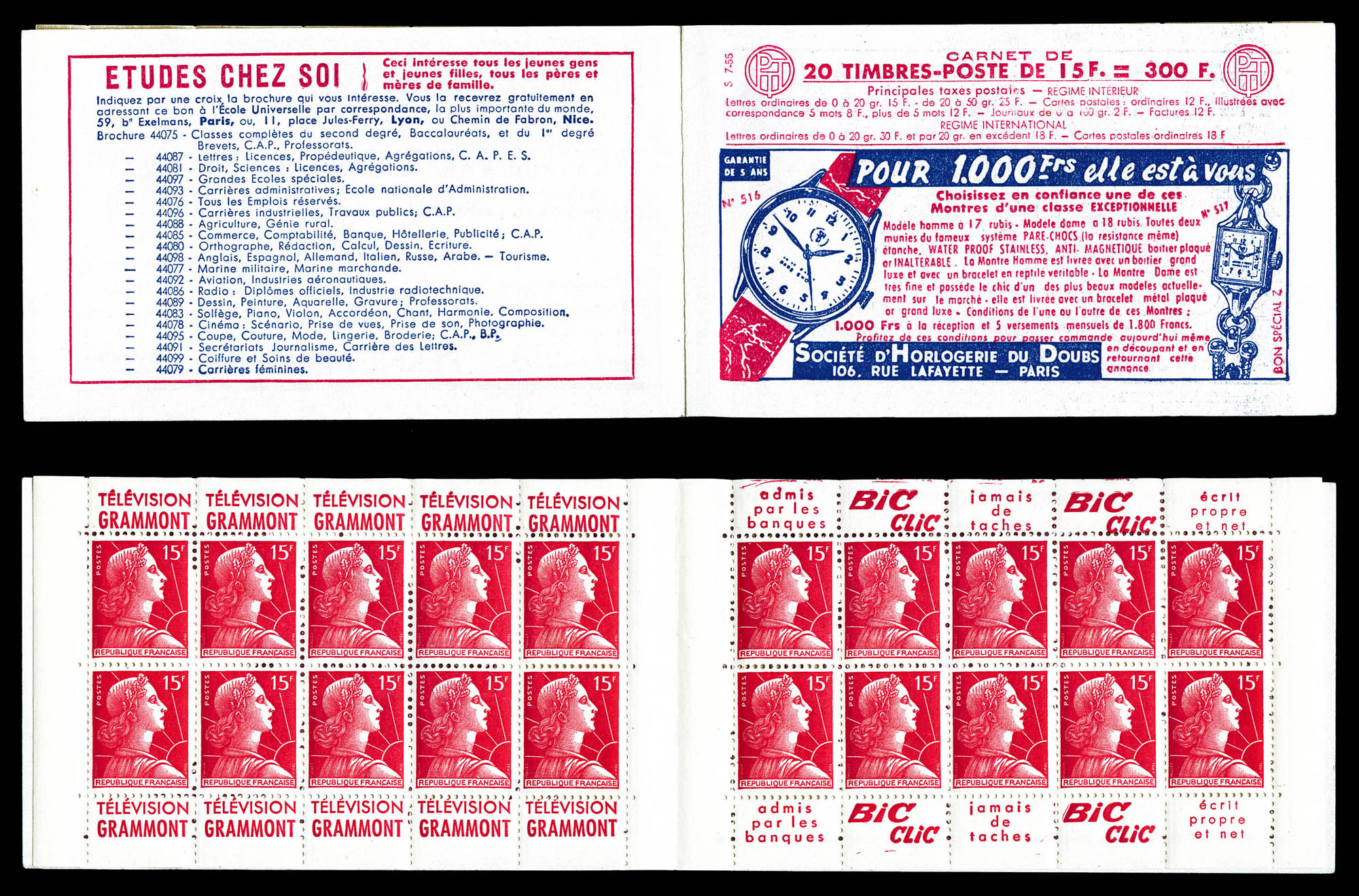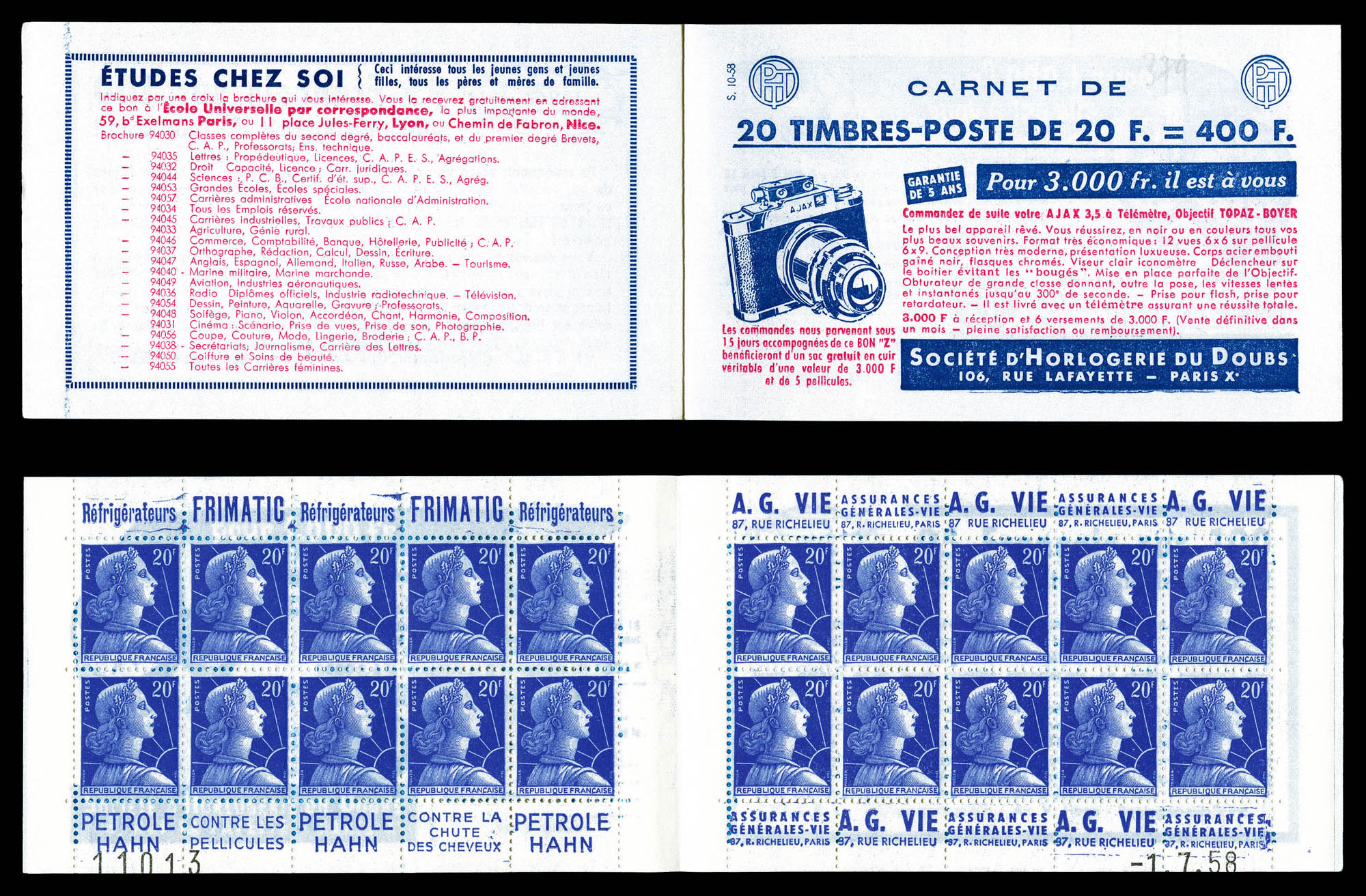 PROVINS, carnet de 20 timbres MIXTE: 10 exemplaires du 15f GANDON (feuillet de gauche) et 10 exemplaires du 15f MULLER (feuillet de