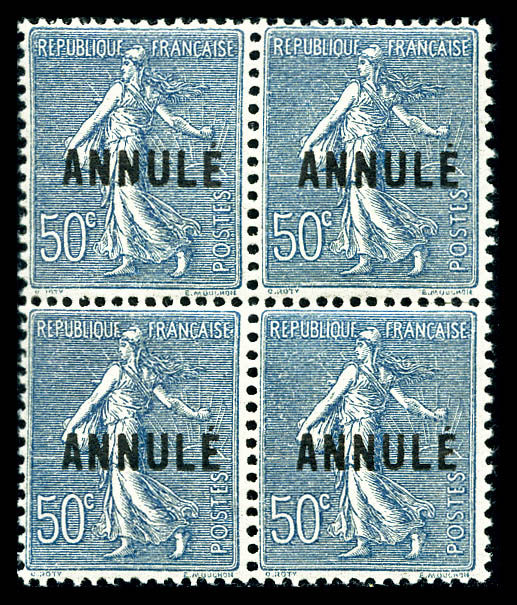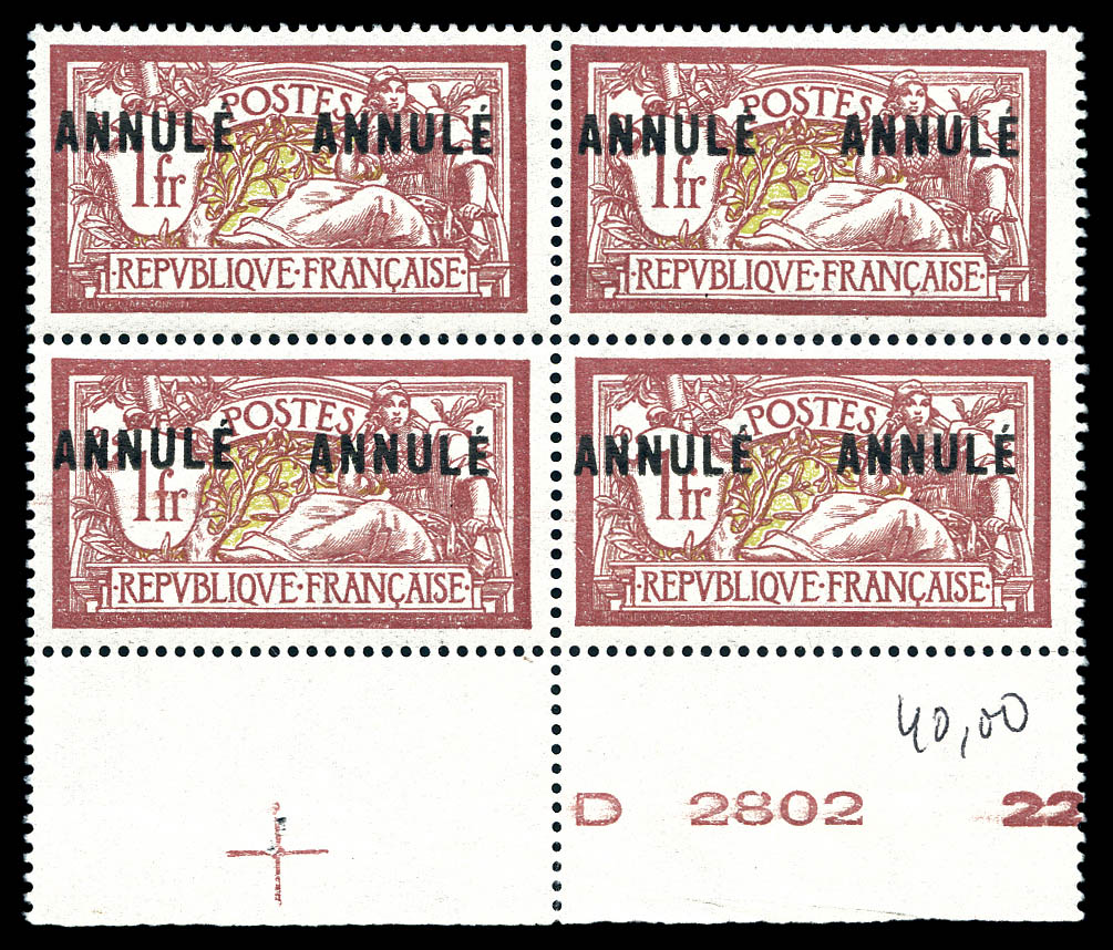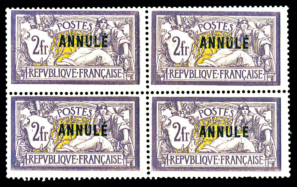 1753 nh imageN°122-CI 1, Merson, 2F violet et jaune surchargé 'ANNULE' en bloc de quatre. SUPERBE. R.R.R. (certificat) Qualité: ** Cote: 15200 euros (Image)