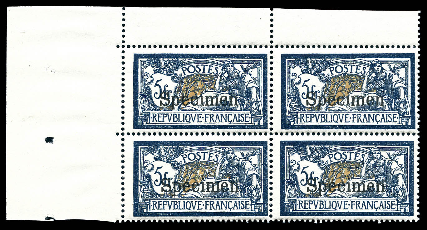 1757 nh imageN°123-CI 3, 5f Merson surchargé 'SPECIMEN', bloc de 4 cdf. SUP. R. (certificat) Qualité: ** Cote: 2000 euros (Image)