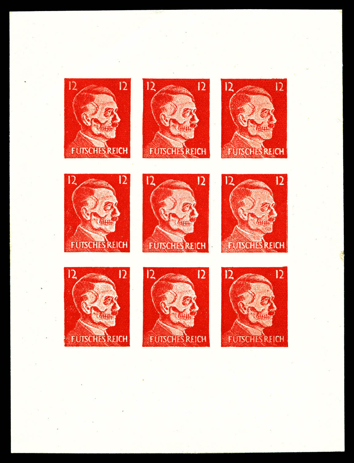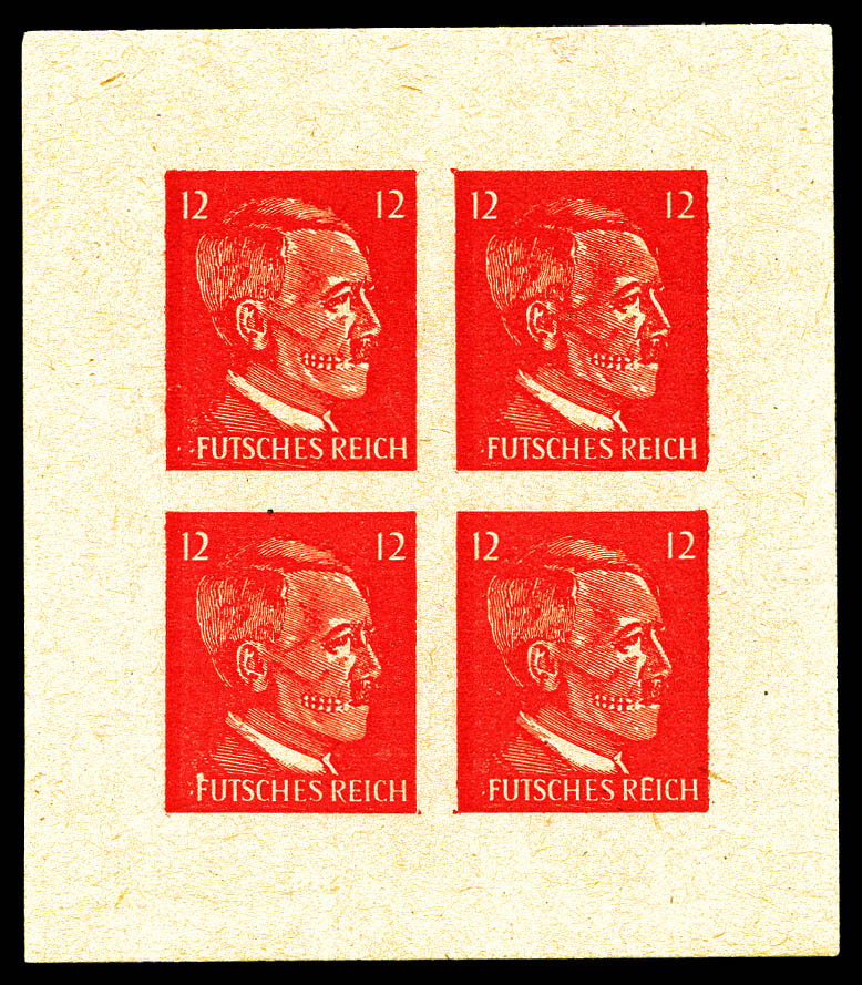 1837 nh imageN°1a, FAUX PROPAGANDE sur timbre Hitler: Type I, imprimé à Vienne (Autriche): 12pf Rouge tête de mort en bloc de quatre non dentelé . SUP. R.R. (certificat) Qualité: ** Cote: 6240 euros (Image)