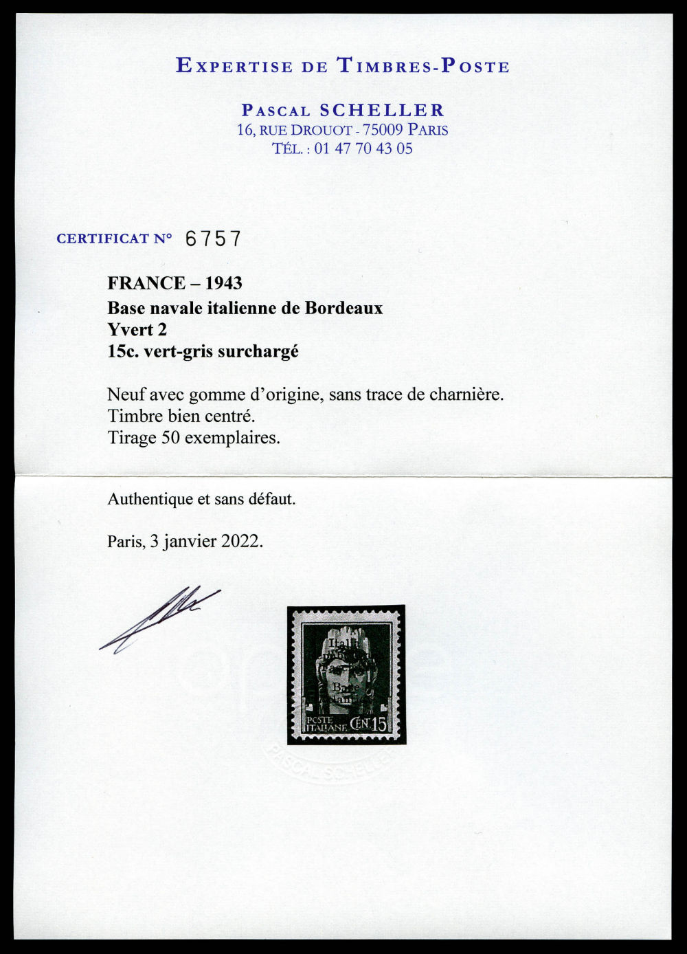 1822 nh imageN°2, 15c. vert-gris, tirage 50 exemplaires, excellent centrage, fraîcheur postale, Superbe. R.R. (signé Scheller/certificat) Qualité: ** Cote: 19000 euros (Image) (imagea) (imageb) (All Images)
