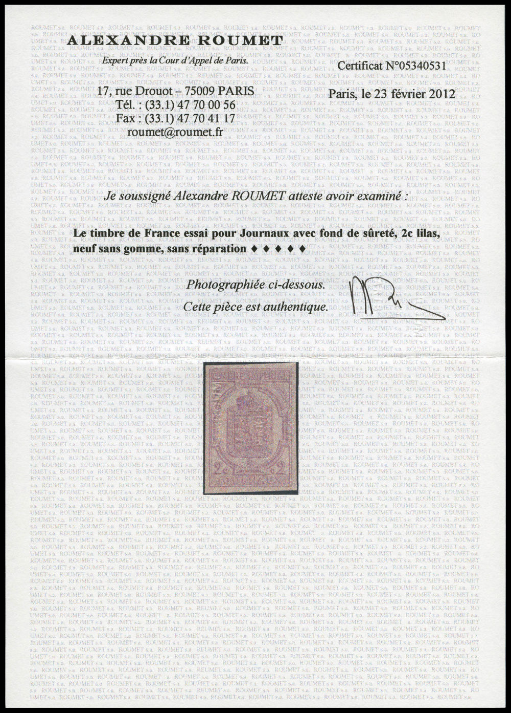 1827 nh imageN°1, 2c lilas non dentelé, impression sur la gomme, rare et superbe (certificat) Qualité: ** (Image)