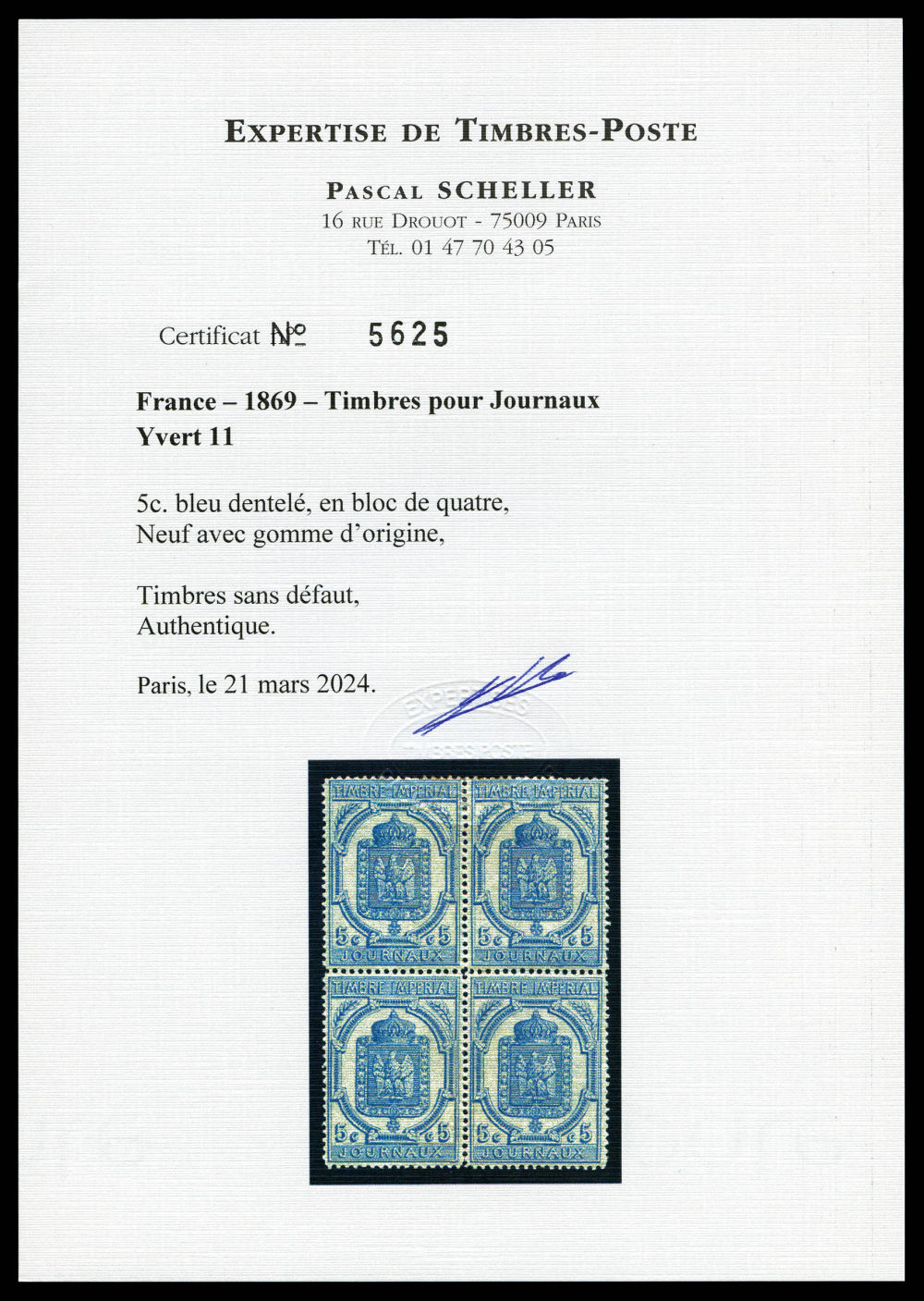 1833 og imageN°11, 5c bleu en bloc de quatre, fraîcheur postale. SUPERBE. R.R. (signé Calves/certificats) Qualité: * Cote: 12000 euros (Image) (imagea) (All Images)