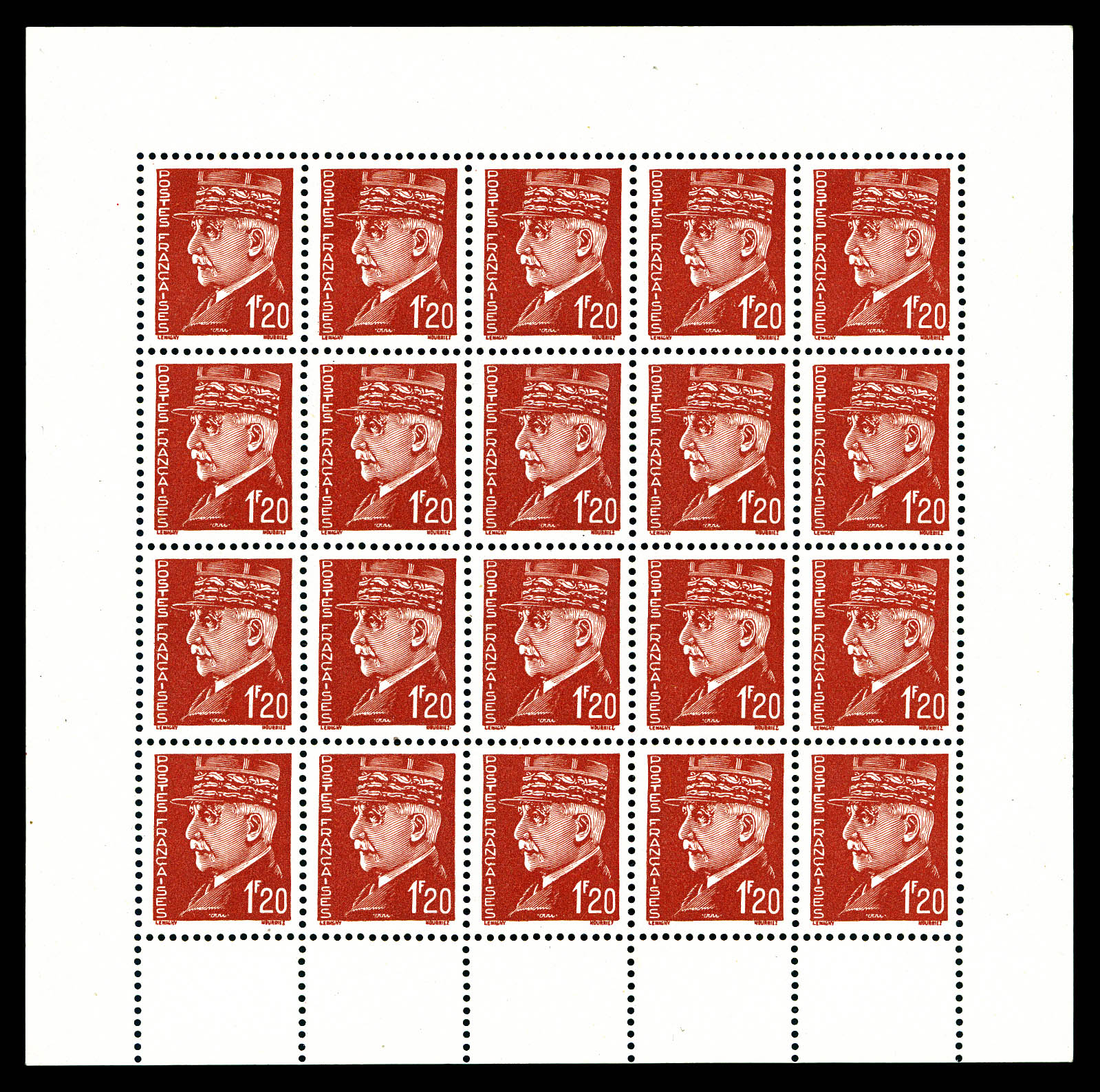 N°8, FAUX DE LONDRES, 1f20 Pétain brun-rouge (N°515), bloc complet de 20 exemplaires. TB. R. (certificat) Qualité: * Cote: 900