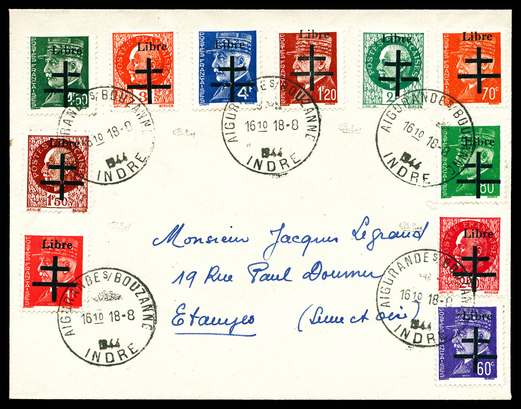 N°1/11, AIGURANDE (Indre): série complète obl càd sur lettre, TB (signé Calves/certificat) Qualité: Oblitéré Cote: 1000 euros (Image)