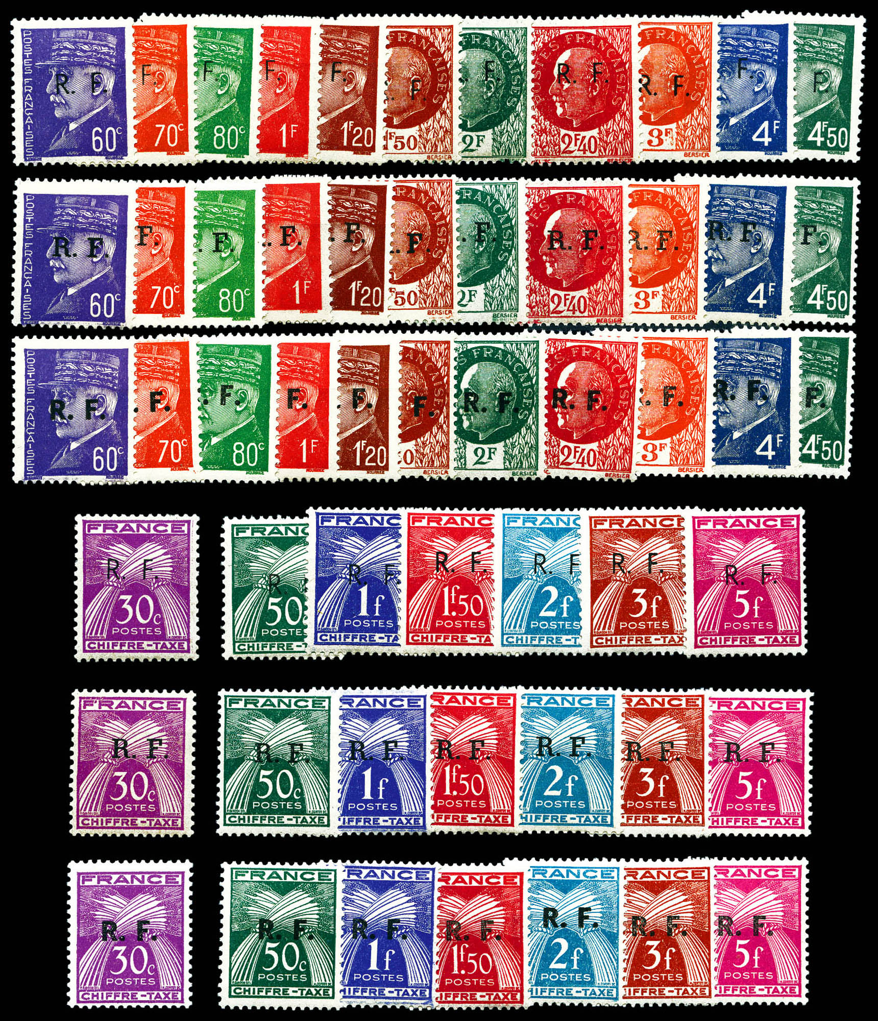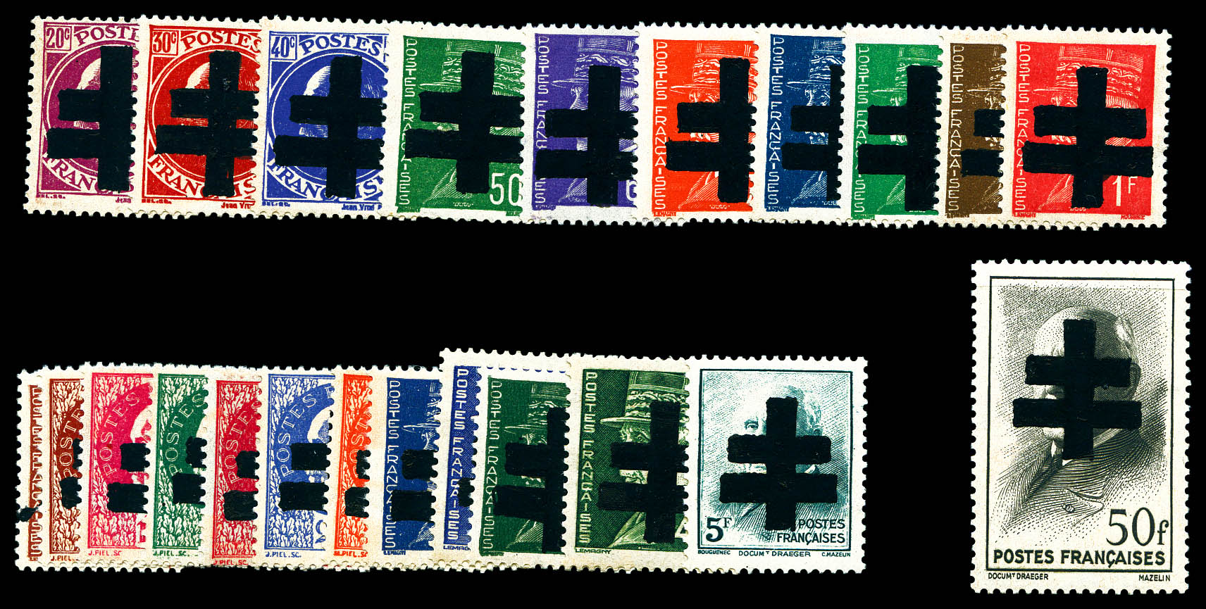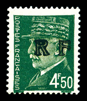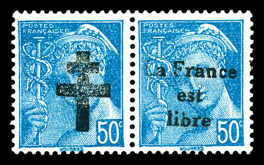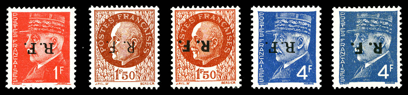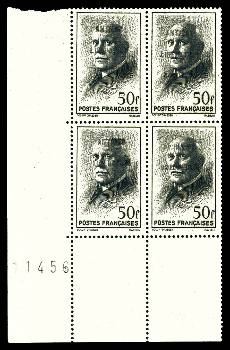 N°37, ANTIBES (Vaucluse): 50f pétain, SURCHARGE RENVERSEE (position 22) tenant à normaux en bloc de 4 coin de feuille numéroté.