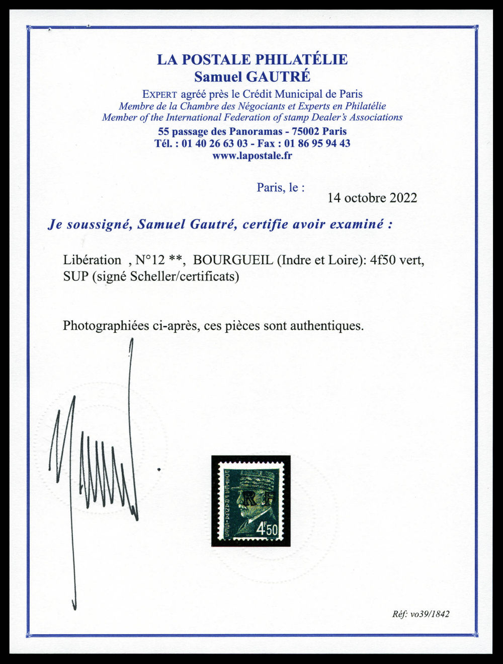 SUPERBE. R. (certificat) Qualité: ** Cote: 4500 euros (Image)