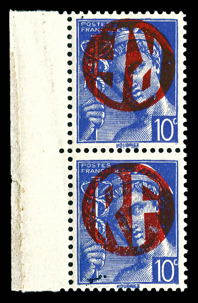 N°1, CHOLET (Maine et Loire), Non émis, SURCHARGE ROUGE RENVERSEE tenant à SURCHARGE ROUGE en paire bdf. SUPERBE. R.R.R (certificat)