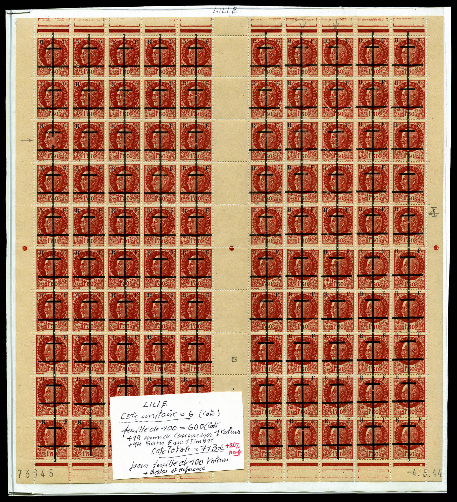 N°1/a/d, LILLE, 1F50: feuille complète de 100 exemplaires dont grande cassure et variété sans 'F'. TB Qualité: ** Cote: 855 euros (Image)