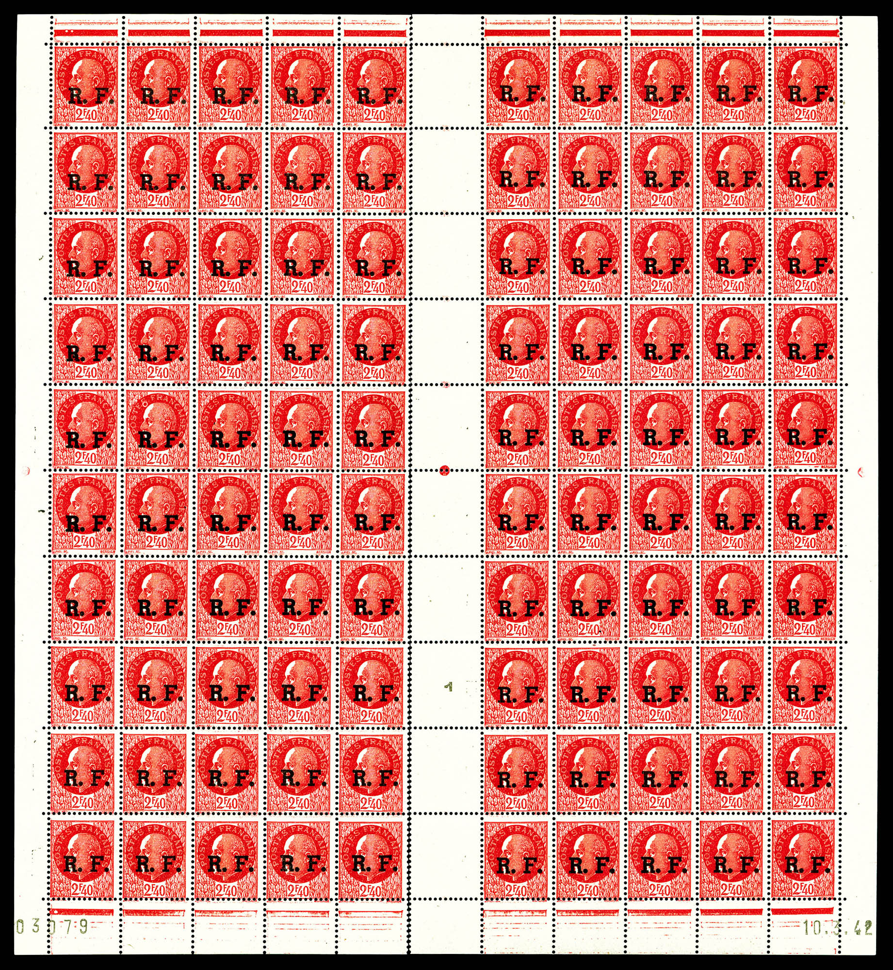 N°13, LYON, 2f 40 rouge, feuille de 100 exemplaires (en 2 panneaux). TTB (certificat) Qualité: ** Cote: 3600 euros (Image)