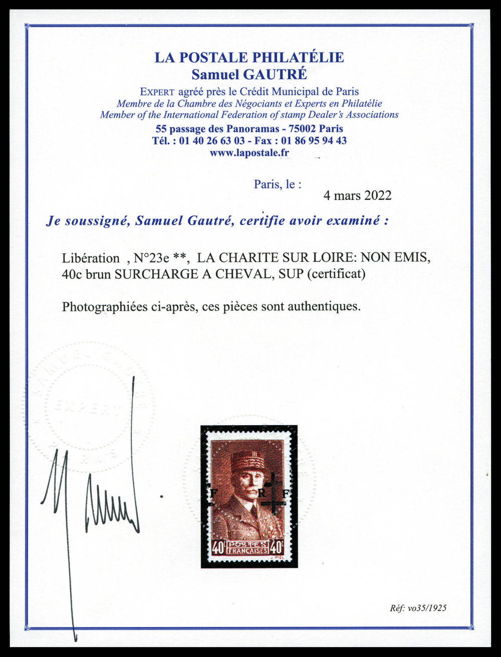 N°23e, LA CHARITE SUR LOIRE: NON EMIS, 40c brun SURCHARGE A CHEVAL, SUP (certificat) Qualité: ** Cote: 1560 euros (Image) (imagea)