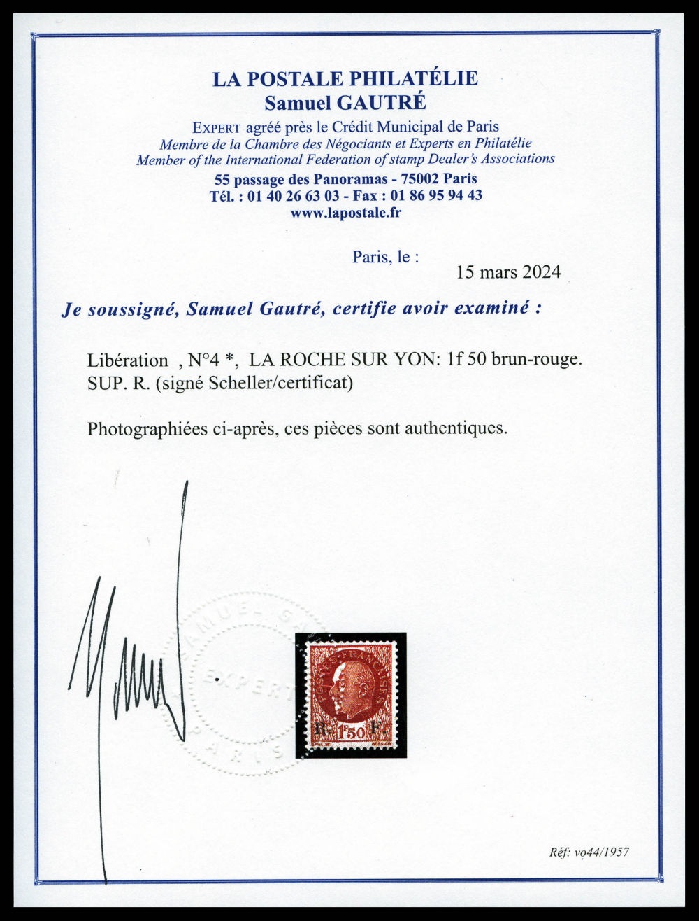 N°4, LA ROCHE SUR YON: 1f 50 brun-rouge. SUP. R. (signé Scheller/certificat) Qualité: * Cote: 1200 euros (Image) (imagea)