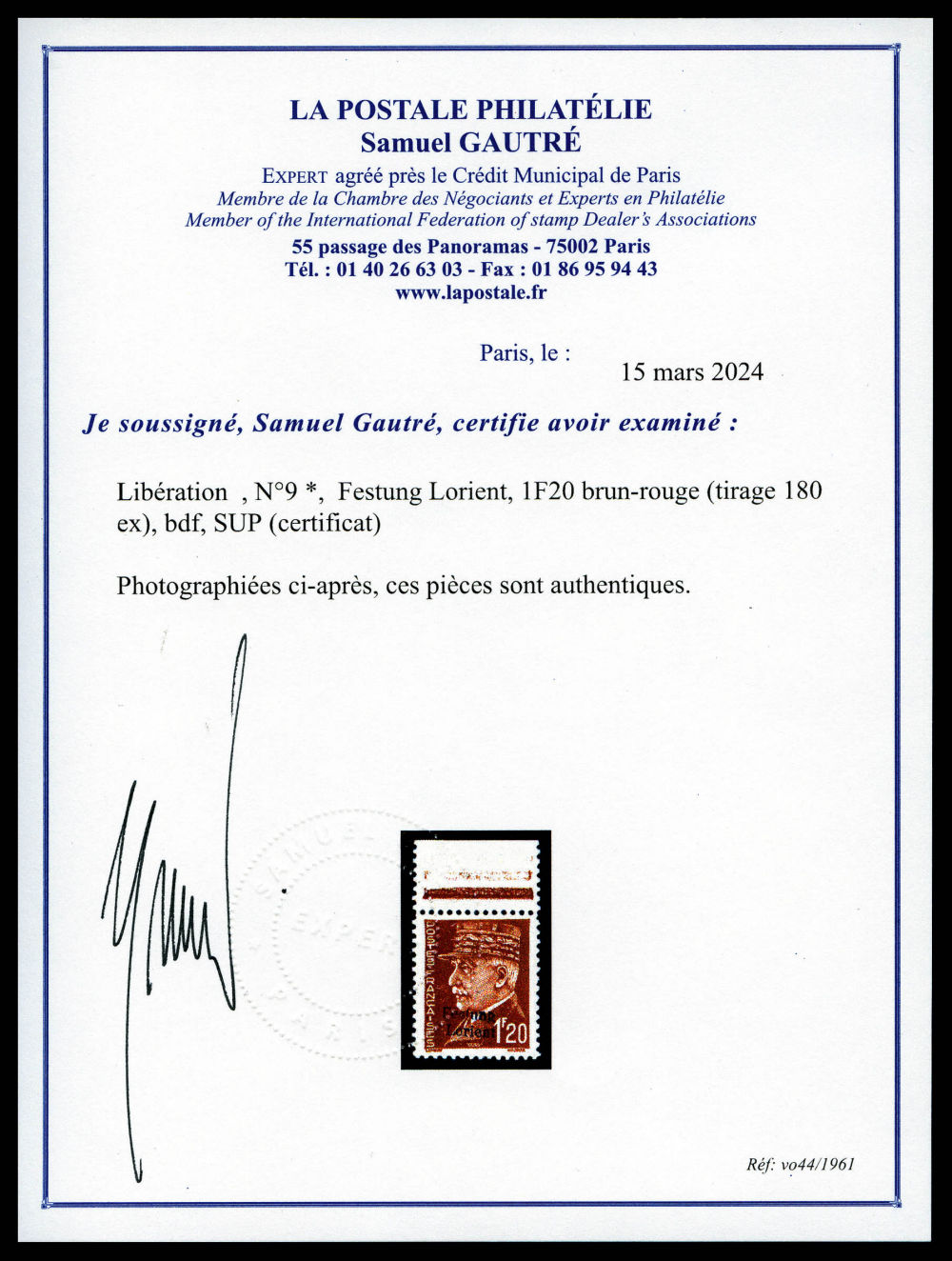 N°9, Festung Lorient, 1F20 brun-rouge (tirage 180 ex), SUP (certificat) Qualité: * Cote: 1350 euros (Image) (imagea)
