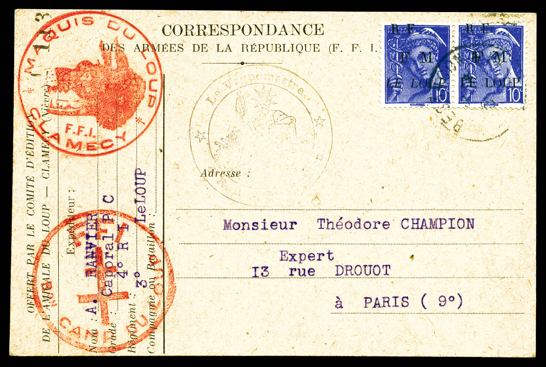 N°1/2, MAQUIS du LOUP: 10c bleu type I et II se tenant sur carte. TTB (certificat) Qualité: Oblitéré Cote: 400 euros (Image)