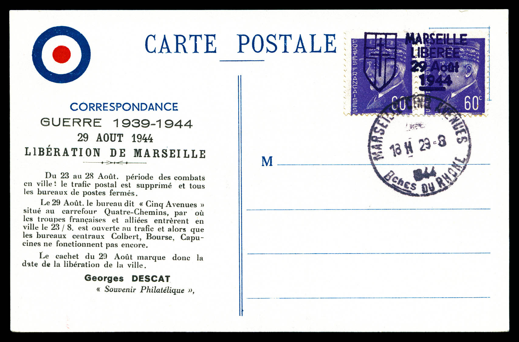 MARSEILLE LIBEREE: 60c pétain surchargé sur carte. TB Qualité: Oblitéré Cote: 275 euros (Image)
