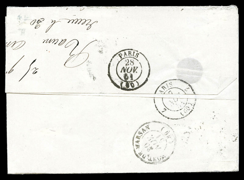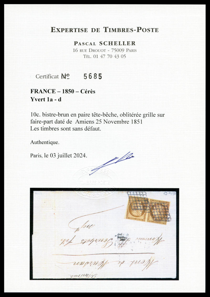 bistre-brun en paire TETE-BECHE oblitérée grille sur faire-part d'AMIENS le 25 novembre 1851 pour Mont de Marsan, SUPERBE. R.R.R. (signé Calves/certificats) Qualité: Oblitéré Cote: 52000 euros (Image) (image2)