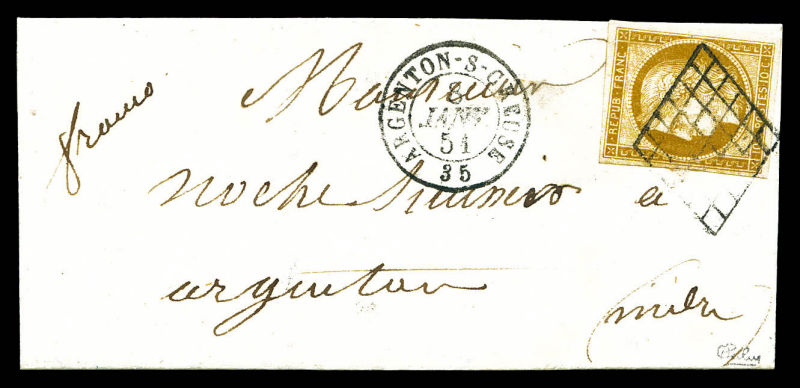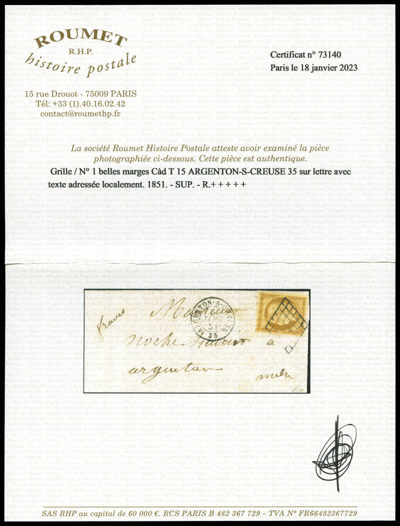 obl grille + càd T 15 ARGENTON-S-CREUSE 35 sur lettre avec texte adressée localement. 1851. SUP. R. (signé Calves/certificats) Qualité: Oblitéré Cote: 775 euros
