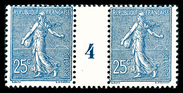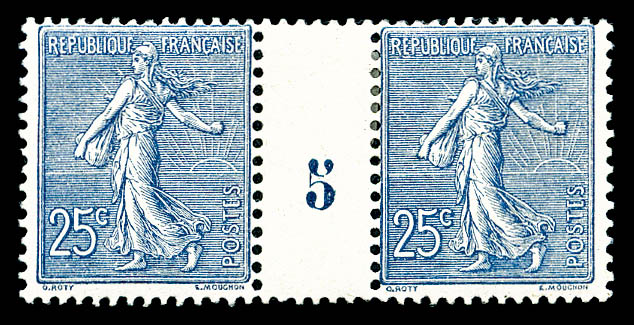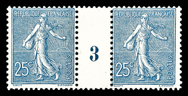 Mouchon, 25c bleu-foncé en paire millésime '3'. SUP (certificat) Qualité: ** Cote: 1200 euros (Image)