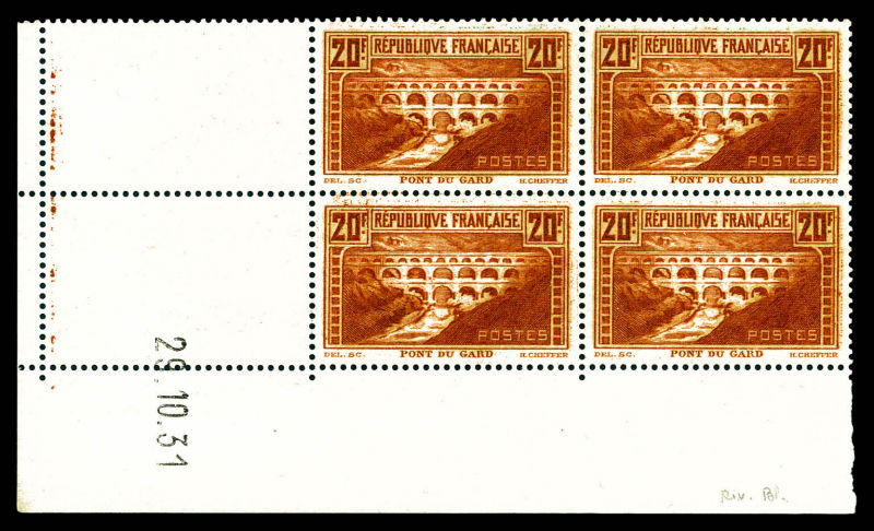 du Gard, 20F chaudron type IIB en bloc de quatre coin de feuille daté du 29/10/1931, SUP (certificat) Qualité: ** Cote: 2800 euros (Image)