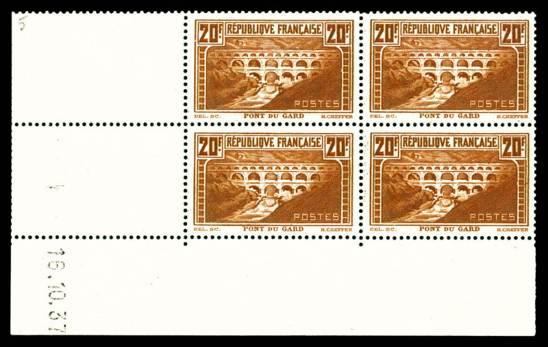 du Gard, 20F chaudron foncé type IIB en bloc de 4 (1ex*) de feuille daté du 16/10/1937. TB(certificat) Qualité: ** Cote: 2800 euros (Image)