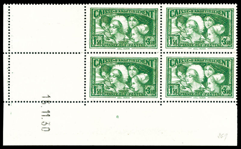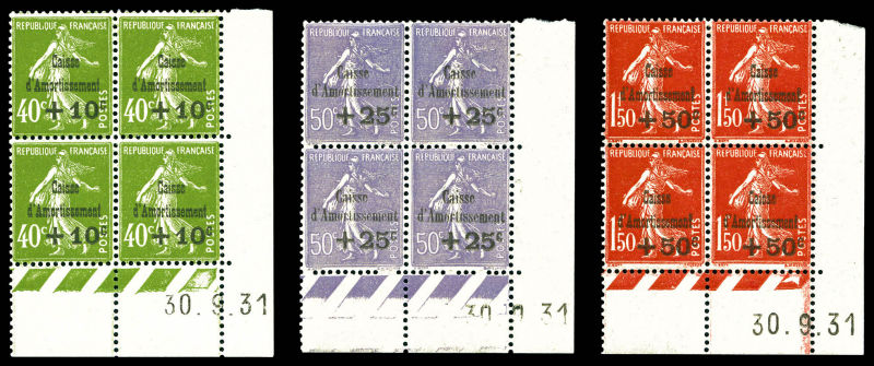 Série Caisse d'Amortissement, les 3 valeurs en blocs de quatre coins de feuilles datés. SUPERBE. R. (certificat) Qualité: ** Cote: 3400 euros (Image)