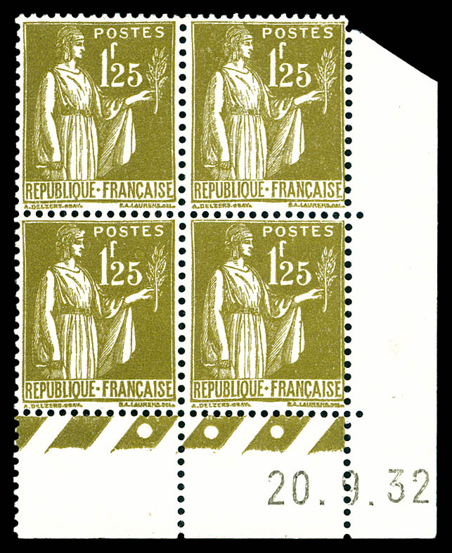 1F 25 olive en bloc de quatre coin de feuille daté du 20/9/1932, jolie pièce, TB (certificat) Qualité: ** Cote: 1050 euros (Image)