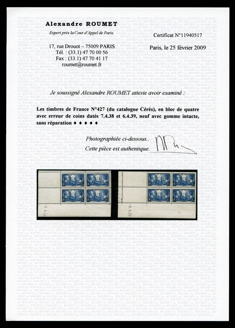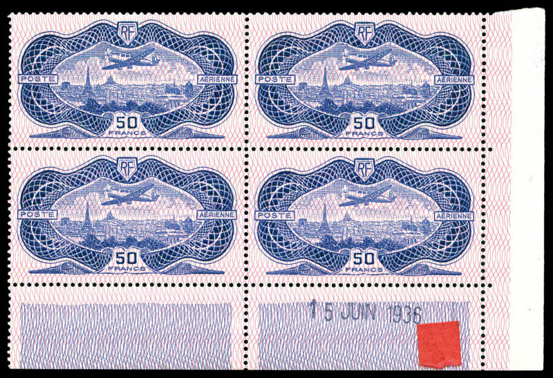 Burelé en bloc de quatre coin de feuille daté du 15 juin 1936, SUPERBE (certificat) Qualité: ** Cote: 7500 euros (Image)