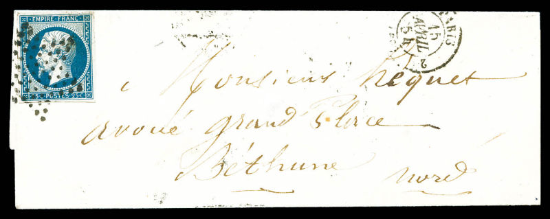 obl étoile (petite fente en marge sup) sur lettre de PARIS le 15 avril 1854 pour Béthune Qualité: Oblitéré Cote: 500 euros (Image) (image2)