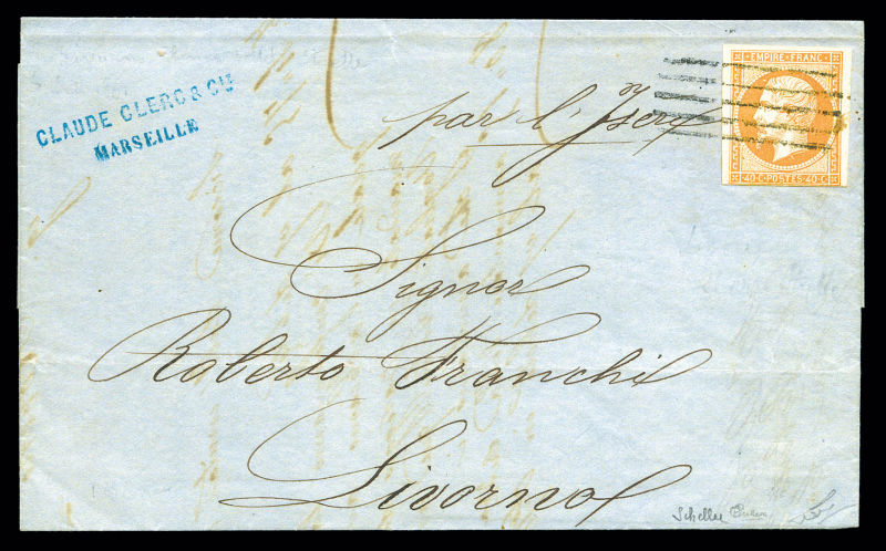 barre de Livourne sur 40c Empire ND sur lettre de Marseille 1864 pour Livourne. SUPERBE. R.R.R (signé Scheller/Calves/certificat) Qualité: Oblitéré (Image) (image2)
