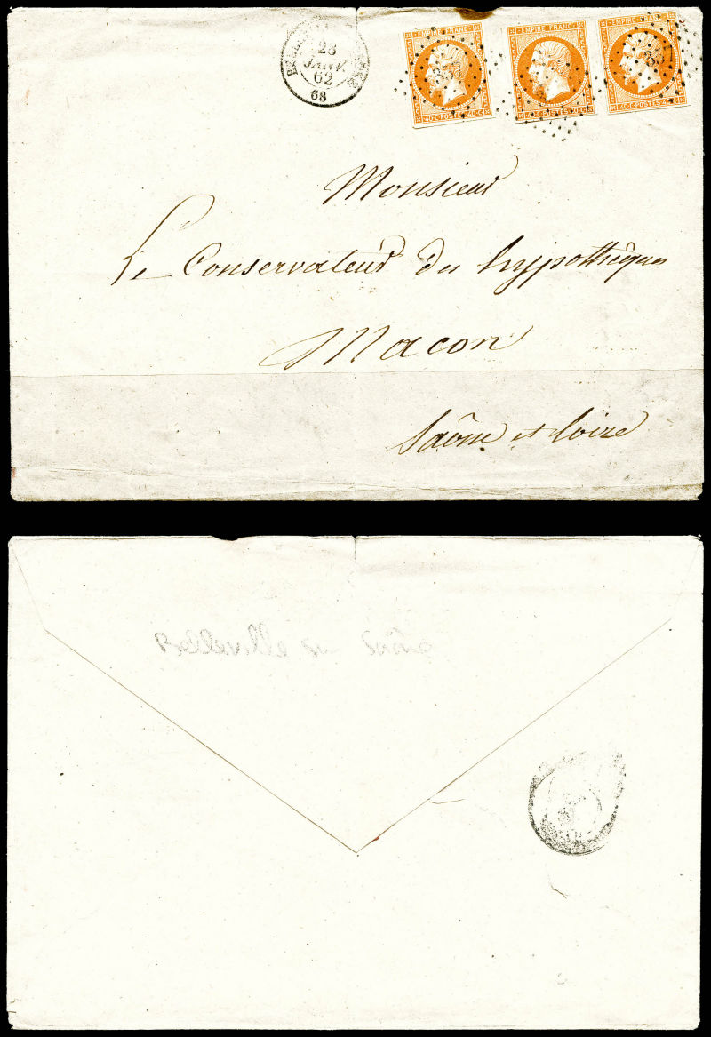 Empire, 3 ex sur Papiers d'affaires 71ème échelon, bande pour un envoi de Belleville sur Saône à Macon le 23 janvier 1862. TB (certificat) Qualité: Oblitéré (Image) (image2)