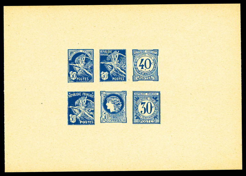2635 imageProjets non émis pour le Type Mouchon, épreuve d'artiste collective de 6 valeurs en rouge sur papier verdâtre, SUP. R. (certificat) Qualité: (*) (Image)