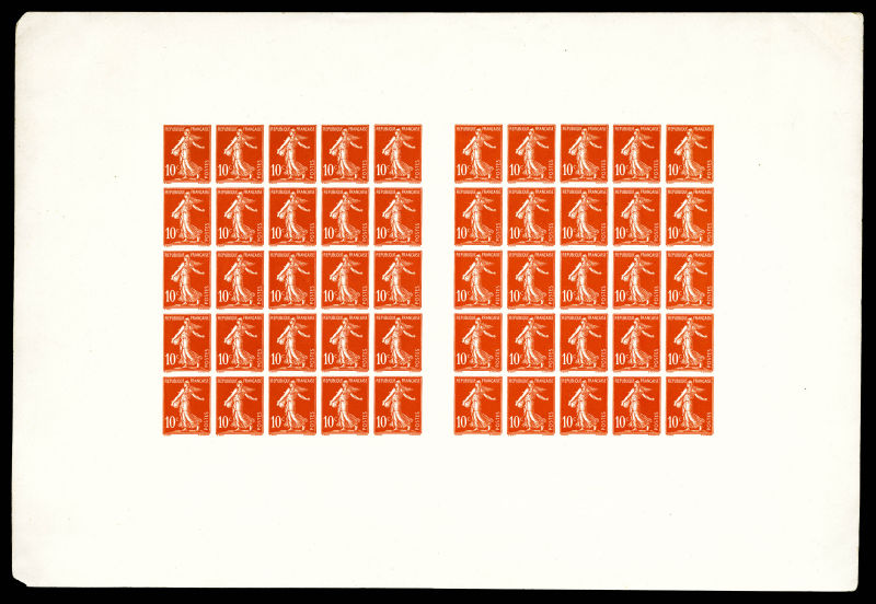 2638 imageN°134, 10c semeuse avec sol non dentelé, tirage sur Bristol. panneau de 50 exemplaires sans millésime (format 320x220mm), avec annotation manuscrite au verso 'tirage N°1 sur les 2 exemplaires tirés'. SUPERBE. R.R.R (certificat) Qualité: (*) Cote: 17500 euros (Image) (image2) (All Images)