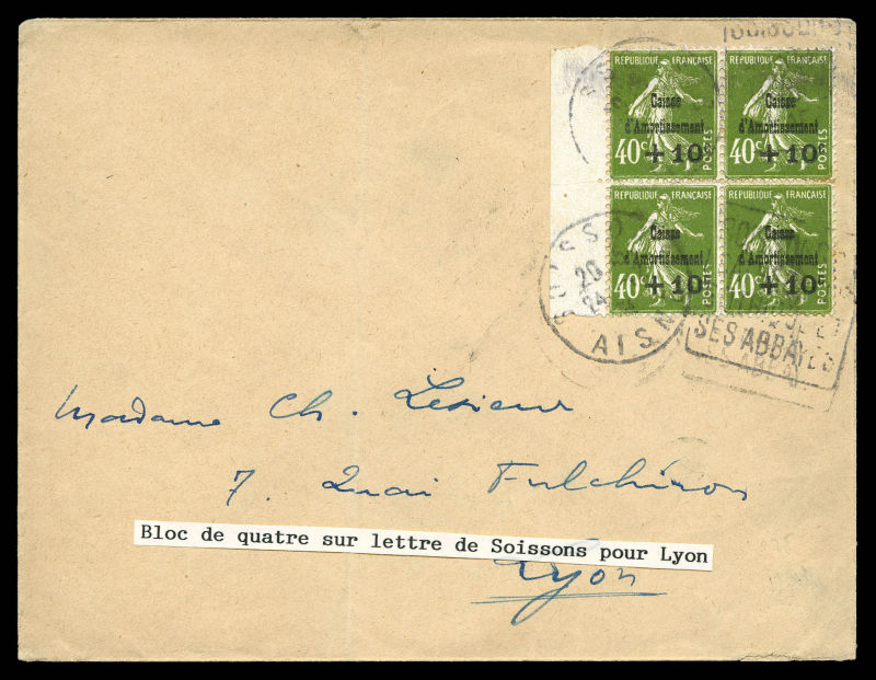 2662 imageN°275, Caisse d'Amortissement: +10c sur 40c olive en bloc de quatre sur lettre de SOISSONS pour Lyon. TTB (certificat) Qualité: Oblitéré (Image)
